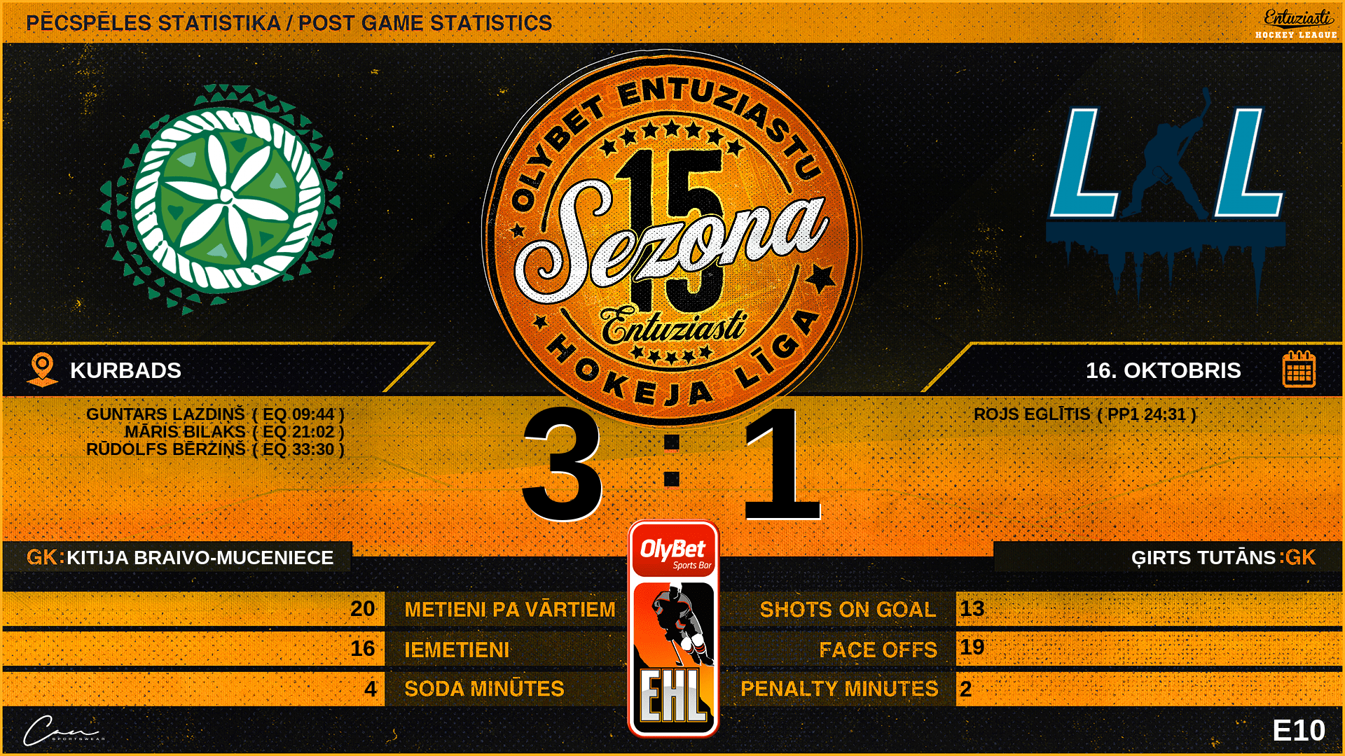| 09:44 | PC3 | Vārti (EQ) | #20 Guntars Lazdiņš, piespēles: #83 Guntars Lazdiņš, #30 Edvards Sviķis |