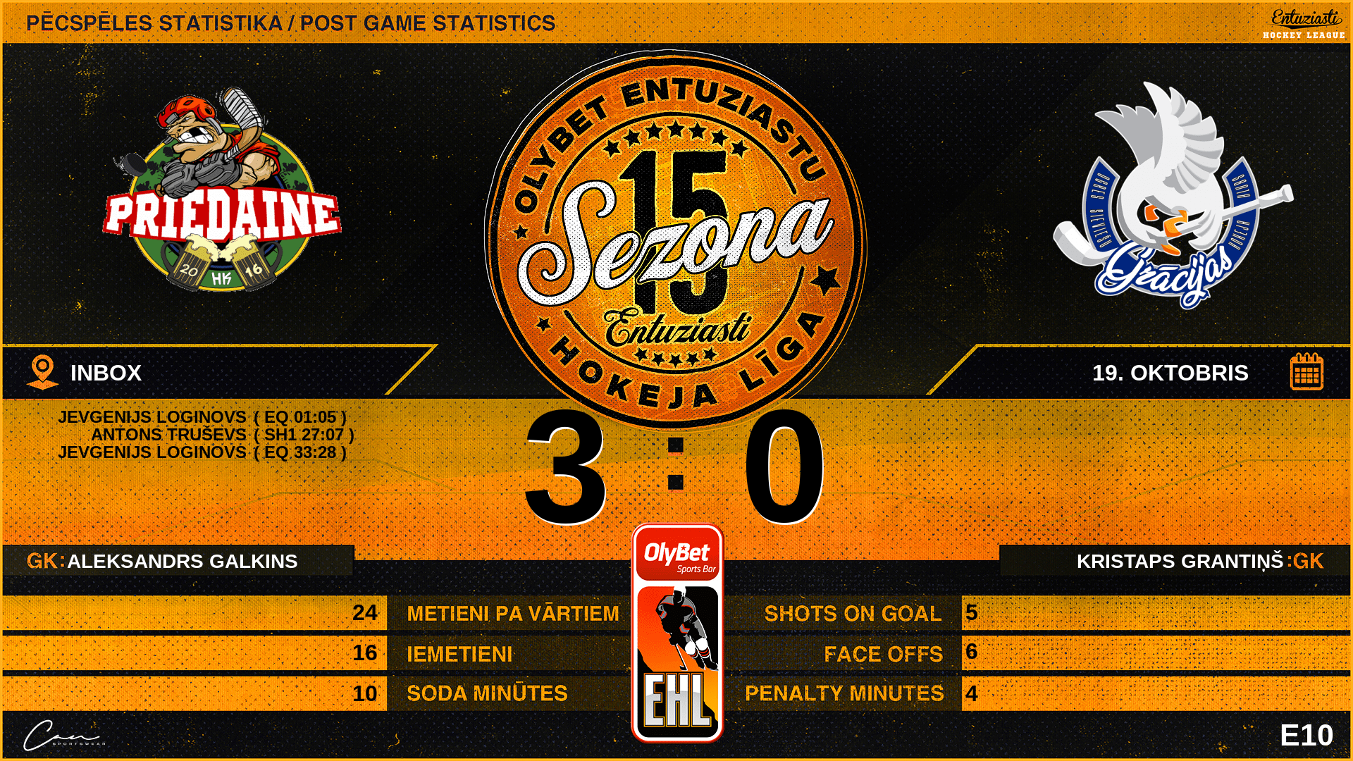| 01:05 | PR2 | Vārti (EQ) | #55 Jevgenijs Loginovs, piespēles: #22 Aleksandrs Kovbasjuks |