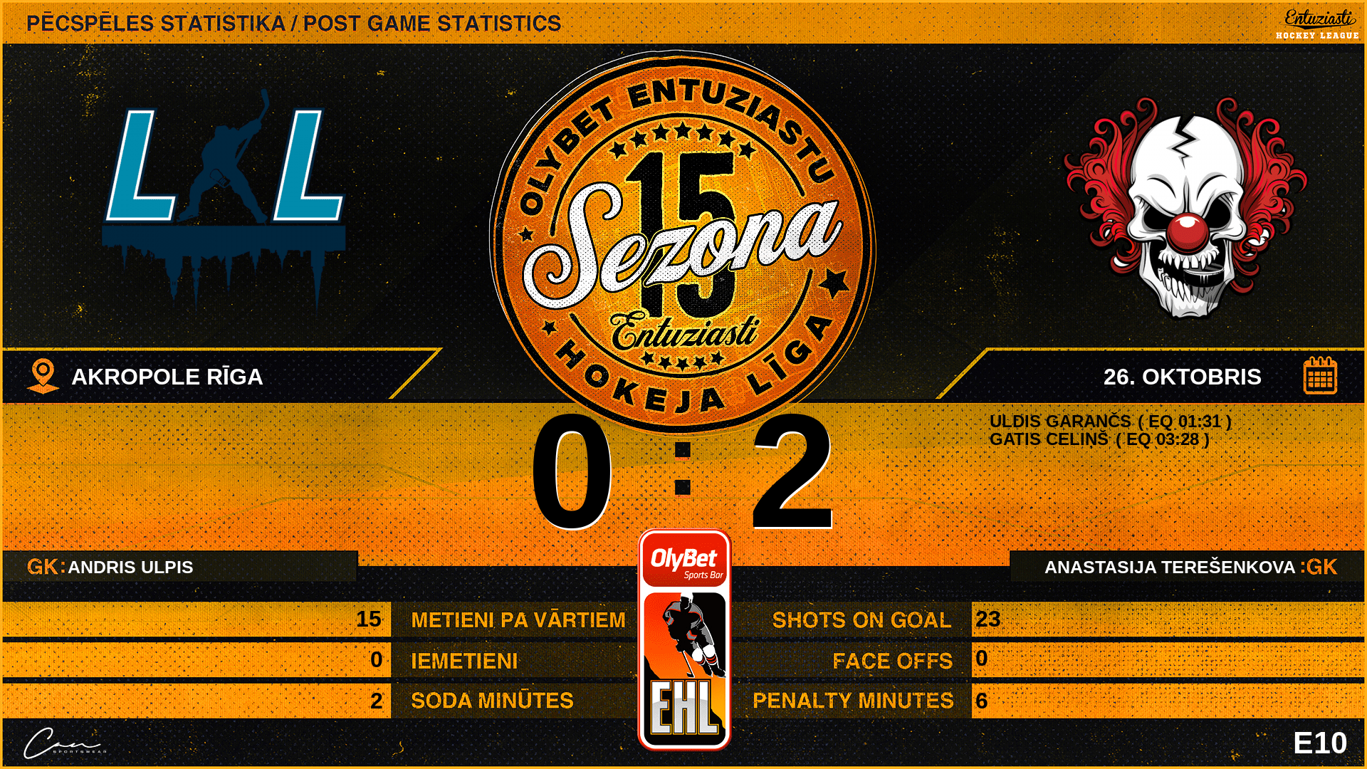 | 03:28 | CR2 | Vārti (EQ) | #5 Gatis Celiņš, piespēles: #10 Oskars Krūze, #85 Viestarts Kaupe |
