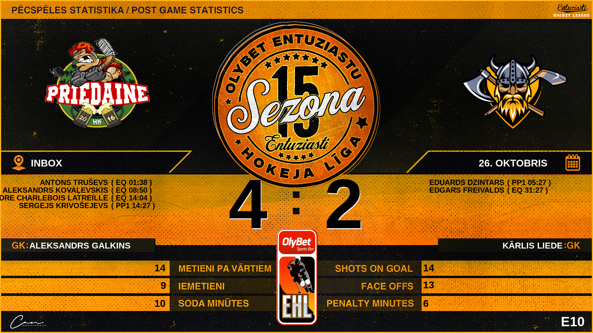 | 31:27 | VN4 | Vārti (EQ) | #41 Edgars Freivalds, piespēles: #36 Kaspars Rudzinskis |