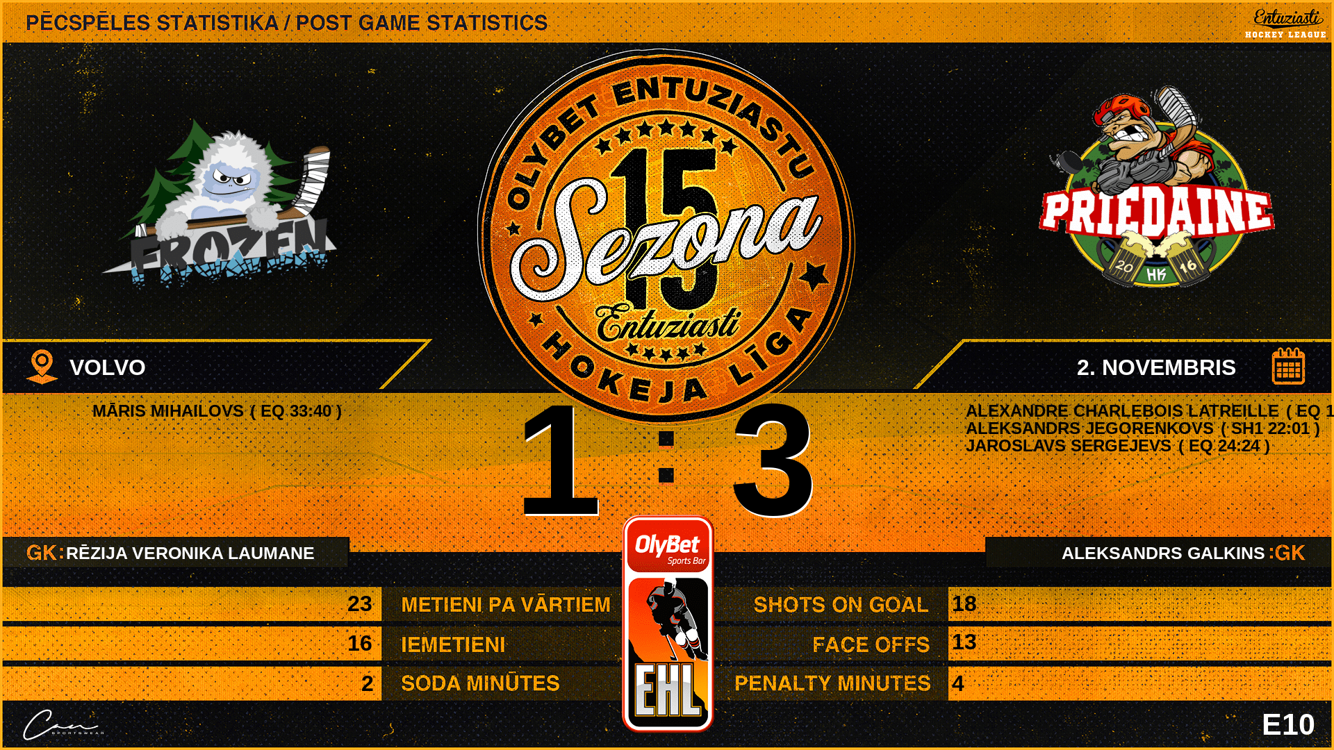 | 33:40 | FRZ | Vārti (EQ) | #2 Māris Mihailovs, piespēles: #77 Roberts Matisons |