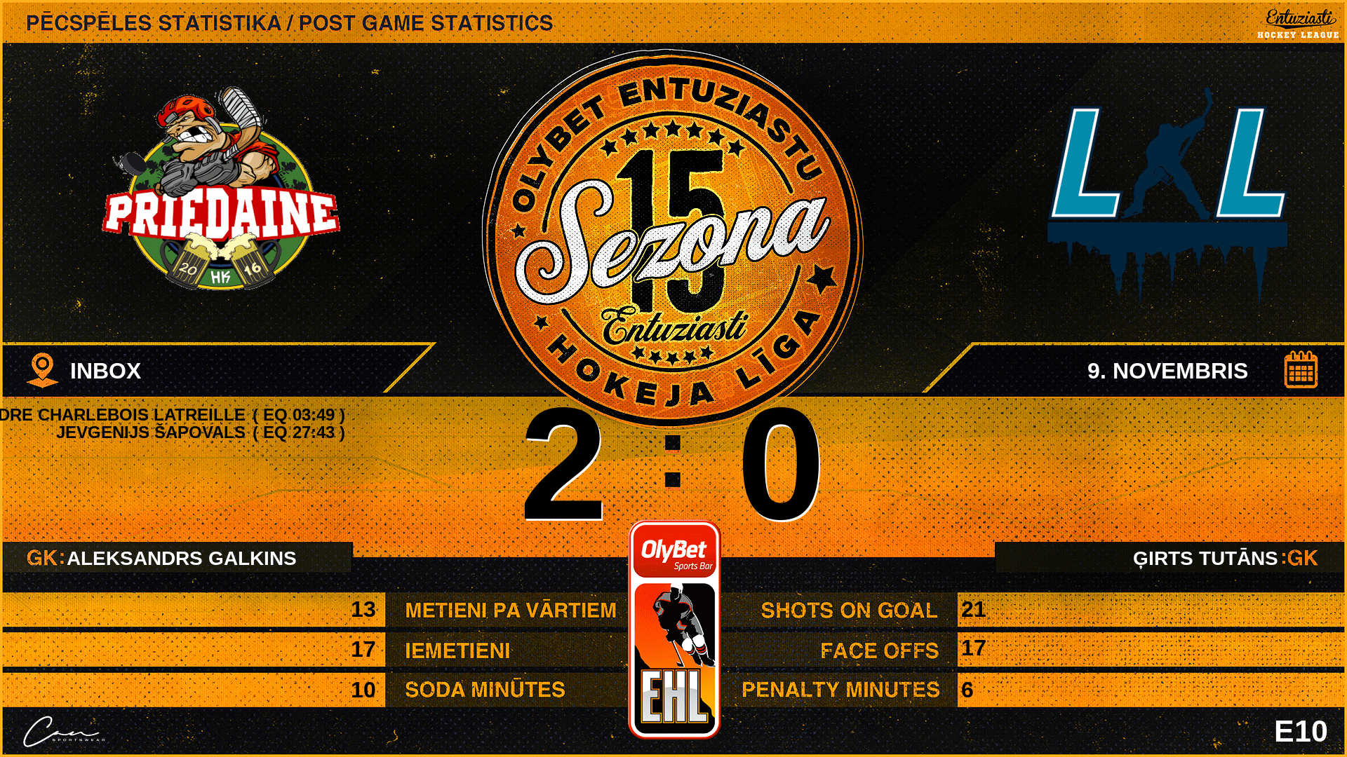 | 00:00 | PR2 | GK In | #1 Aleksandrs Galkins |