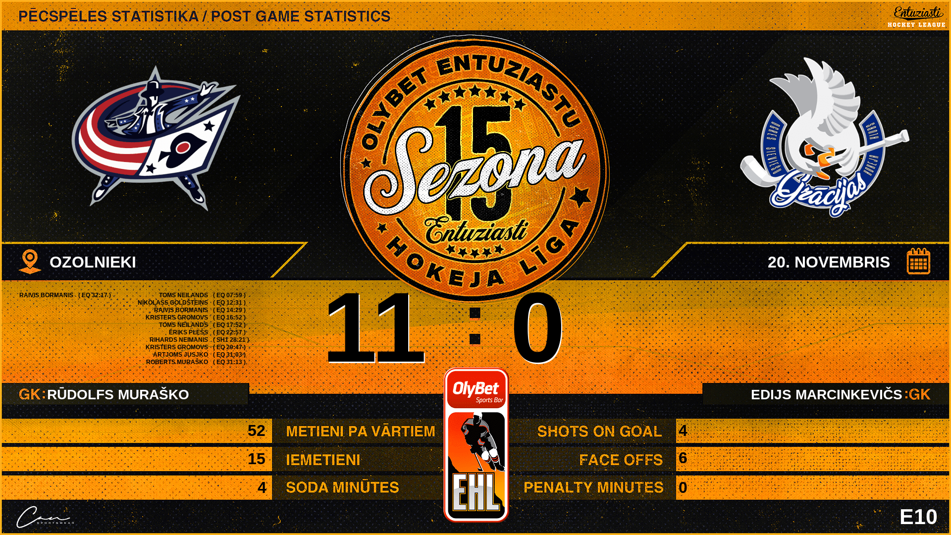 | 16:52 | BM2 | Vārti (EQ) | #42 Kristers Gromovs, piespēles: #88 Gatis Svīķis, #17 Nikolass Goldšteins |