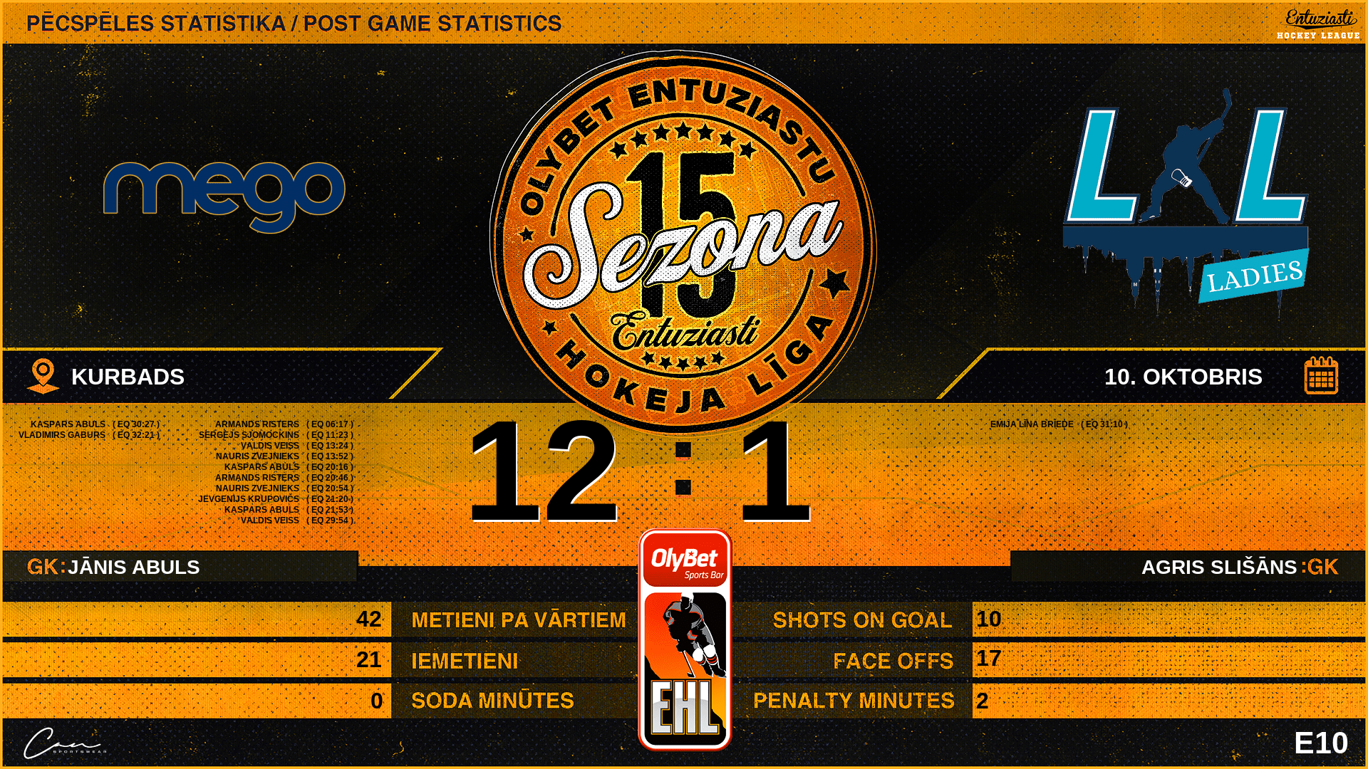 | 20:16 | MG2 | Vārti (EQ) | #16 Kaspars Abuls, piespēles: #81 Andrejs Baranovs, #4 Armands Risters |
