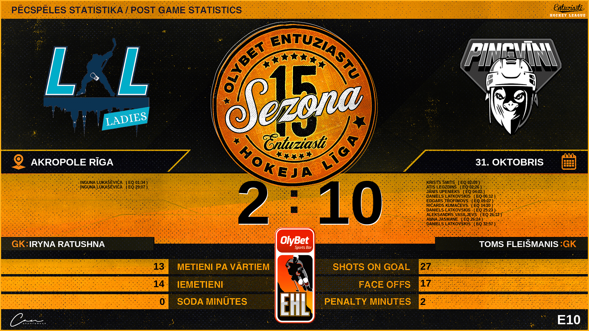 | 02:26 | PNX | Vārti (EQ) | #53 Atis Legzdiņš, piespēles: #24 Ričards Kumačevs, #77 Vilis Skujenieks |