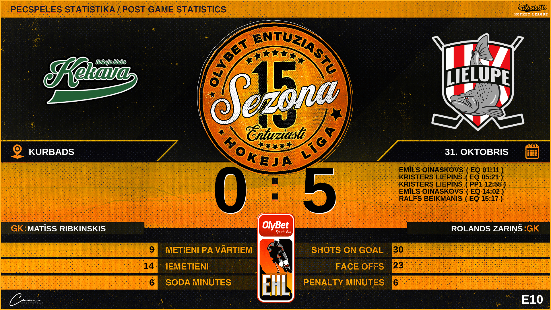 | 36:00 | ĶK5 | GK Out | #1 Matīss Ribkinskis |