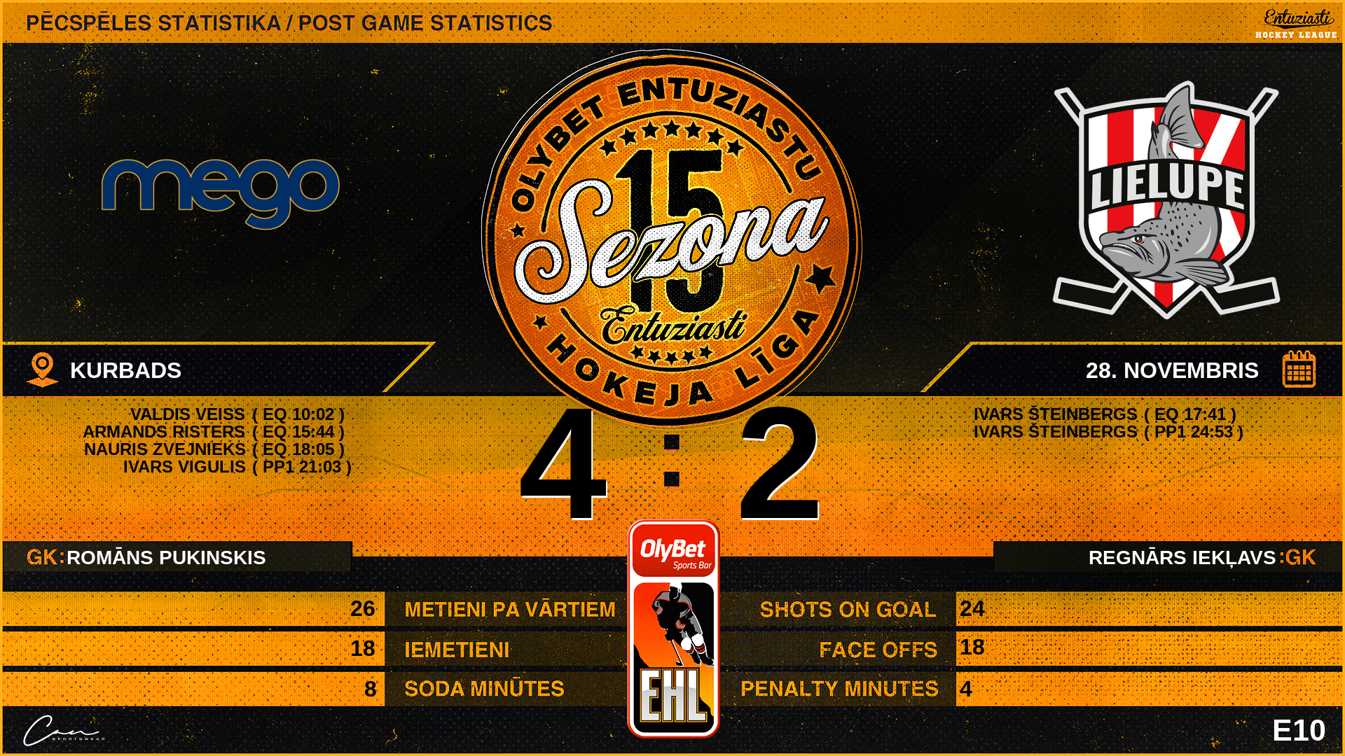 | 18:05 | MG2 | Vārti (EQ) | #42 Nauris Zvejnieks, piespēles: #32 Andrejs Rolinskis |