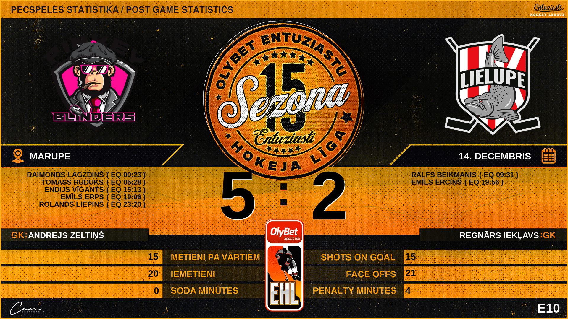 | 15:13 | PB2 | Vārti (EQ) | #28 Endijs Vīgants, piespēles: #94 Tomass Ruduks |