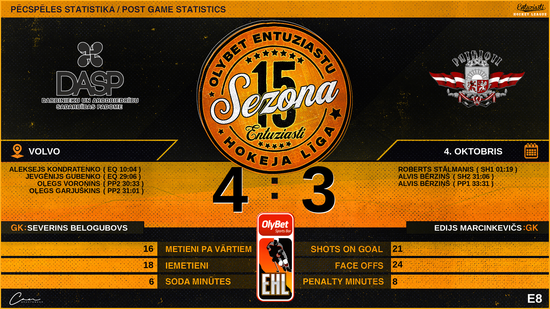 10:04 | DAS | Vārti (EQ) | #59 Aleksejs Kondratenko, piespēles: #50 Jevgēnijs Gubenko, #27 Aivars Vilnis |