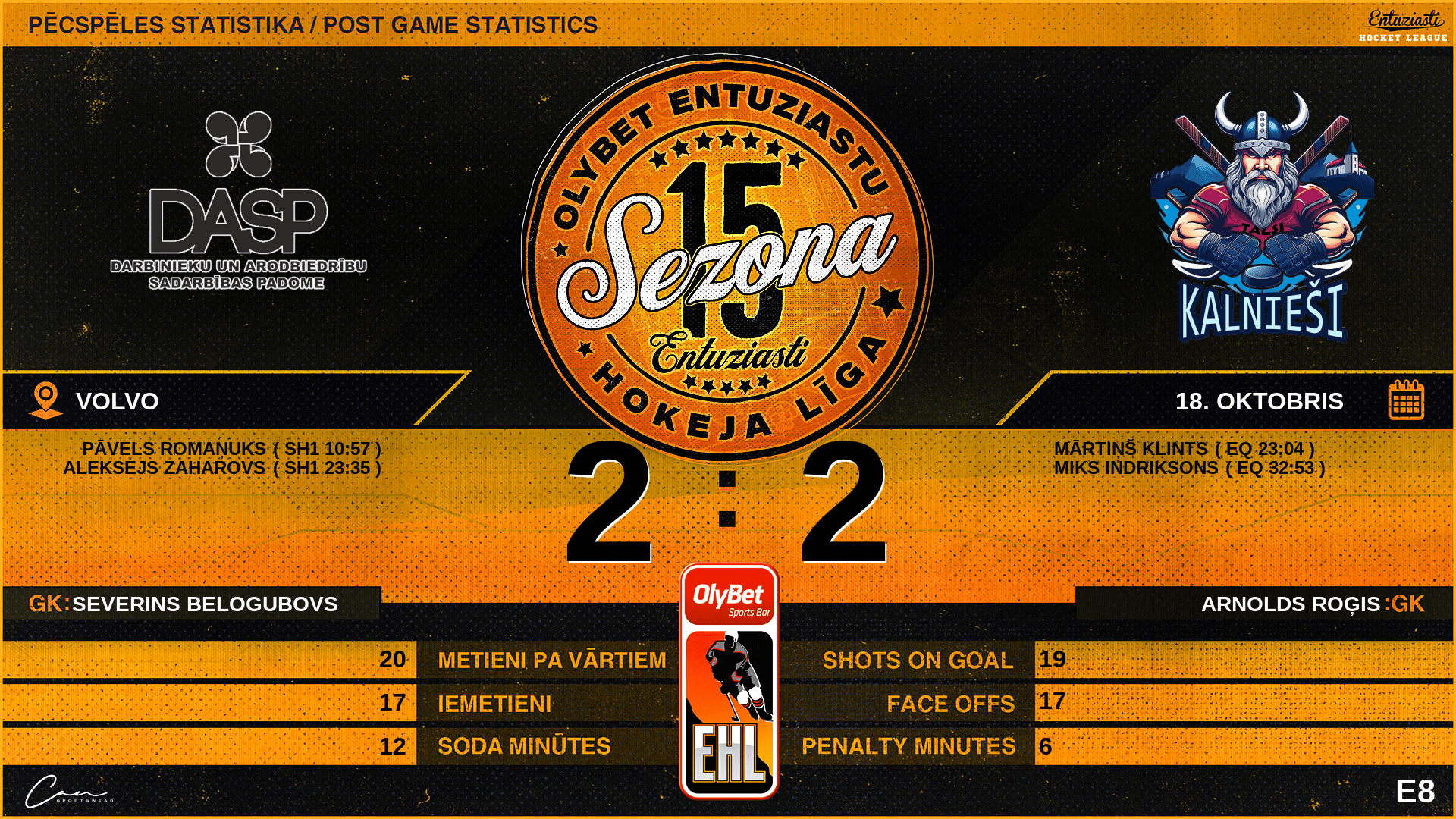 | 23:35 | DAS | Vārti (SH1) | #5 Aleksejs Zaharovs, piespēles: #10 Oļegs Voroņins |