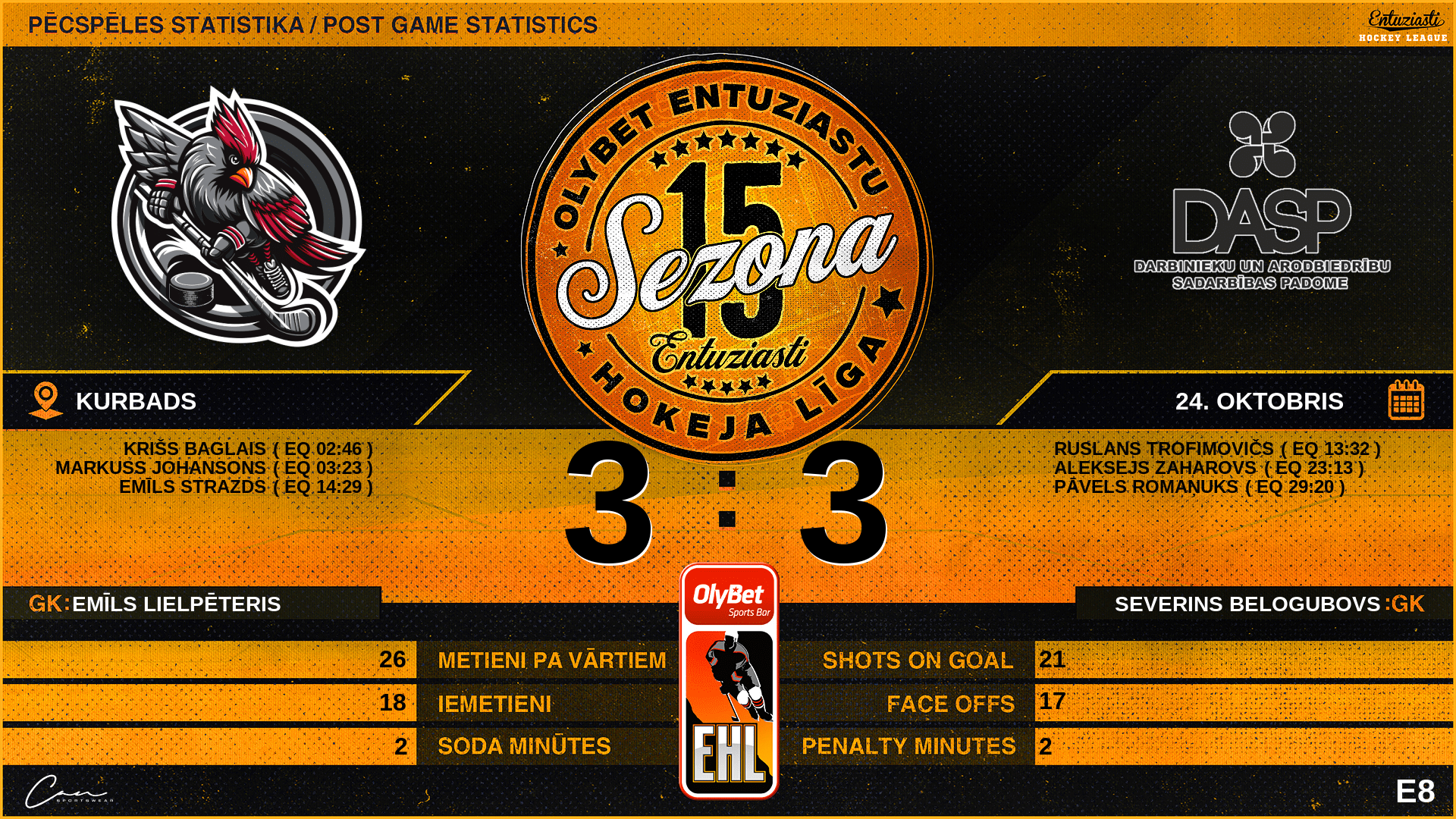 | 14:29 | PLK | Vārti (EQ) | #92 Emīls Strazds, piespēles: #43 Guntis Strazds, #6 Markuss Johansons |