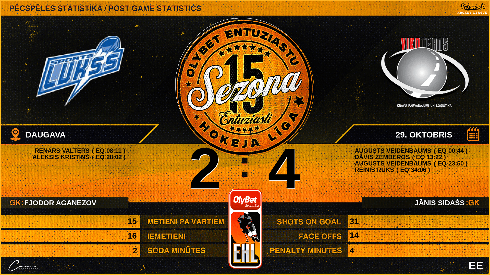| 34:06 | VKE | Vārti (EQ) | #19 Reinis Ruks, piespēles: #69 Lenards Roze |
