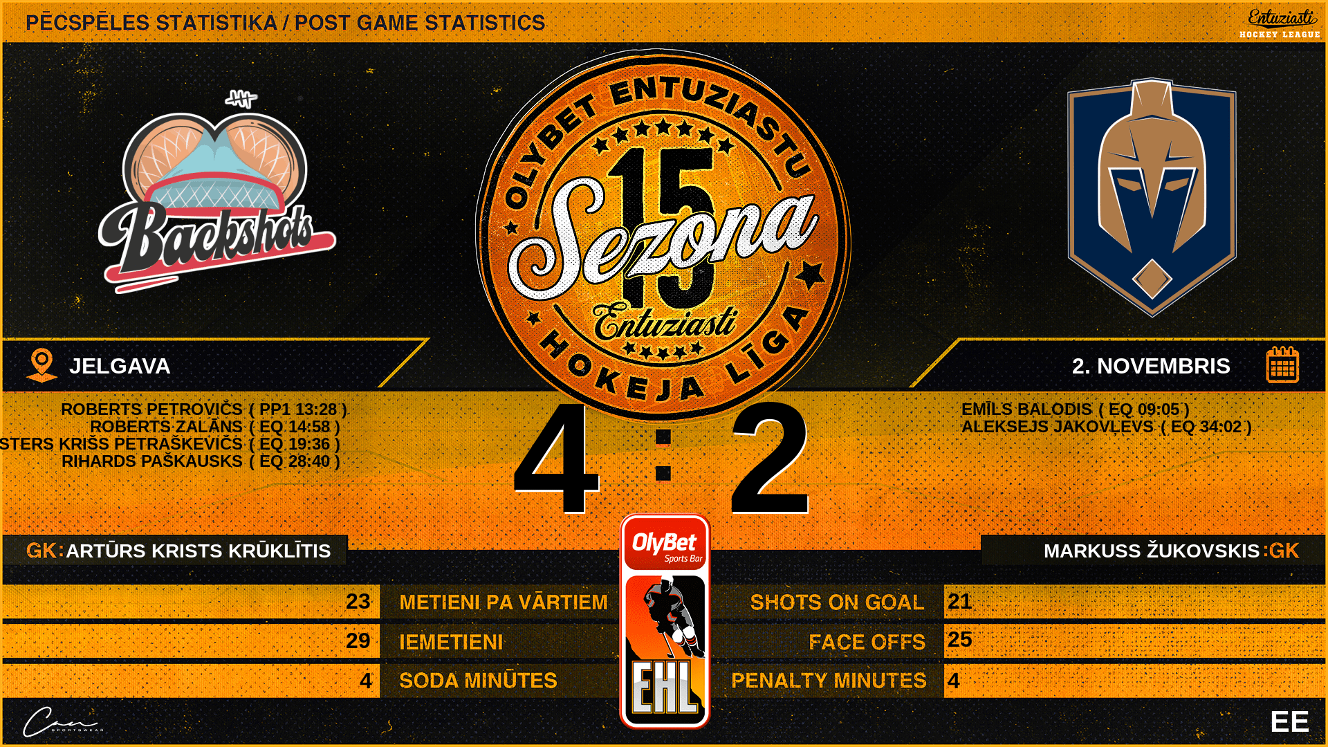 | 34:02 | VLM | Vārti (EQ) | #74 Aleksejs Jakovļevs, piespēles: #94 Martins Kristens Brālēns |