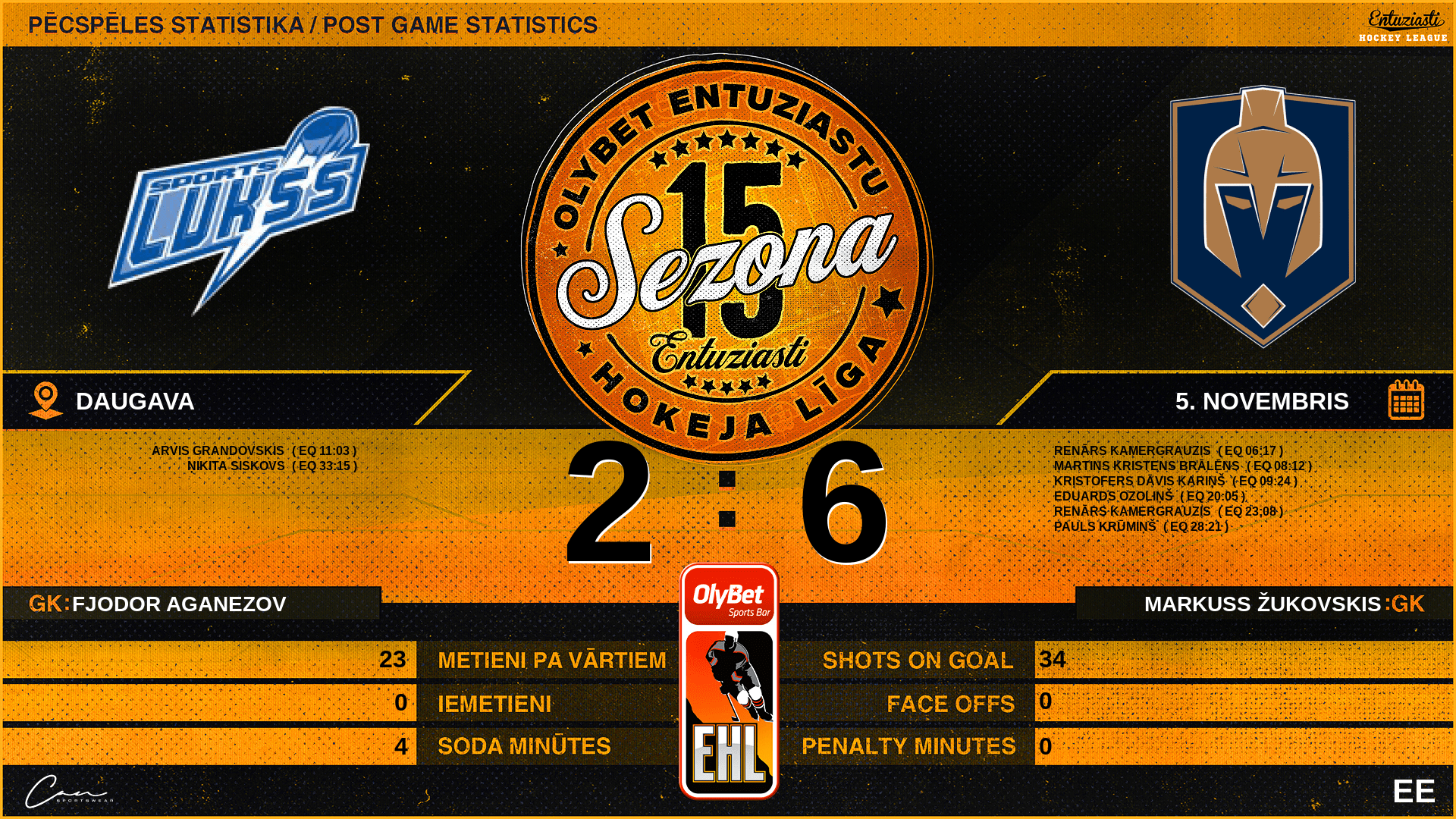 | 20:05 | VLM | Vārti (EQ) | #16 Eduards Ozoliņš, piespēles: #89 Kristofers Dāvis Kariņš |