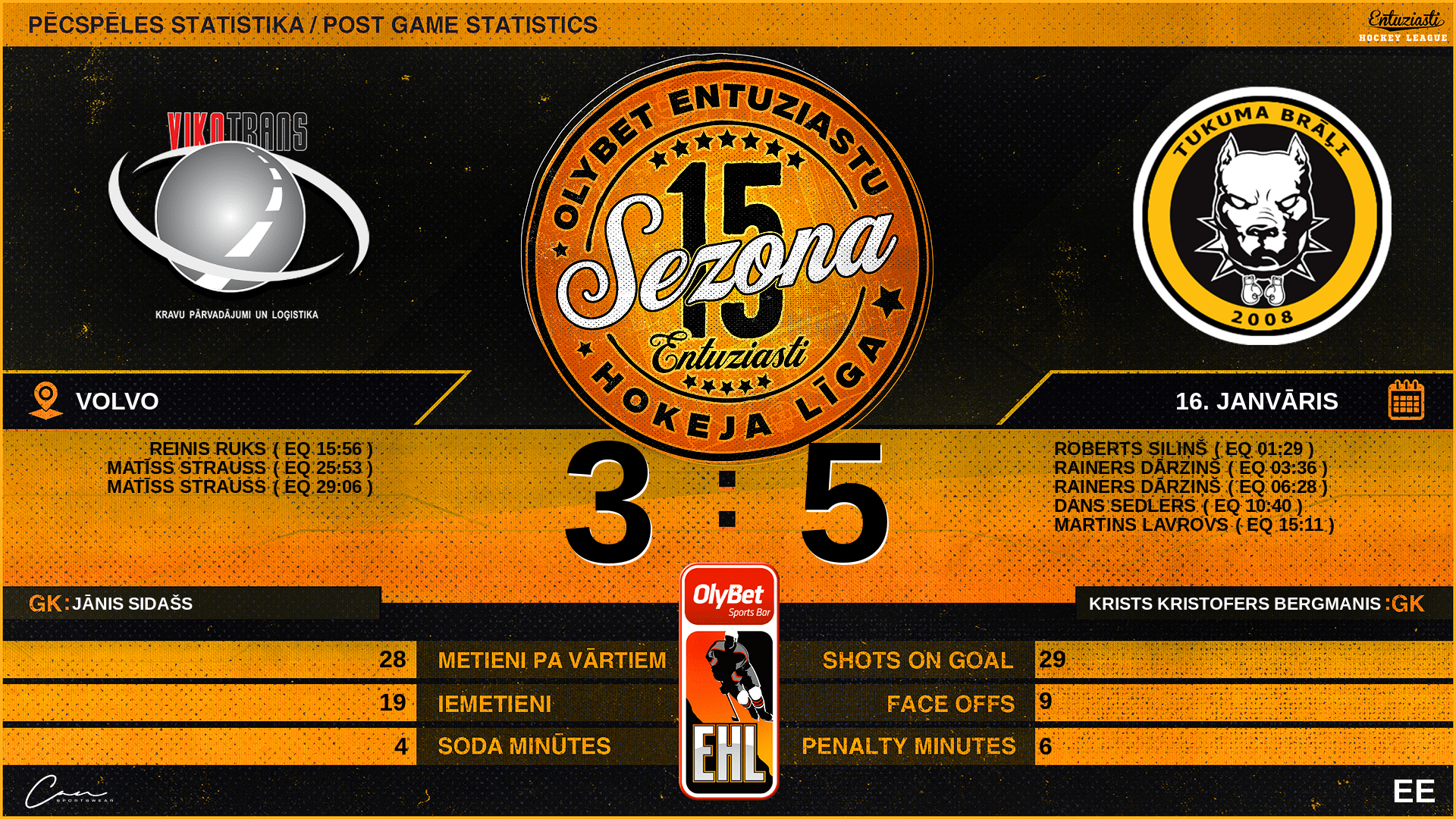 | 15:11 | TMB | Vārti (EQ) | #38 Martins Lavrovs, piespēles: #3 Rainers Dārziņš |