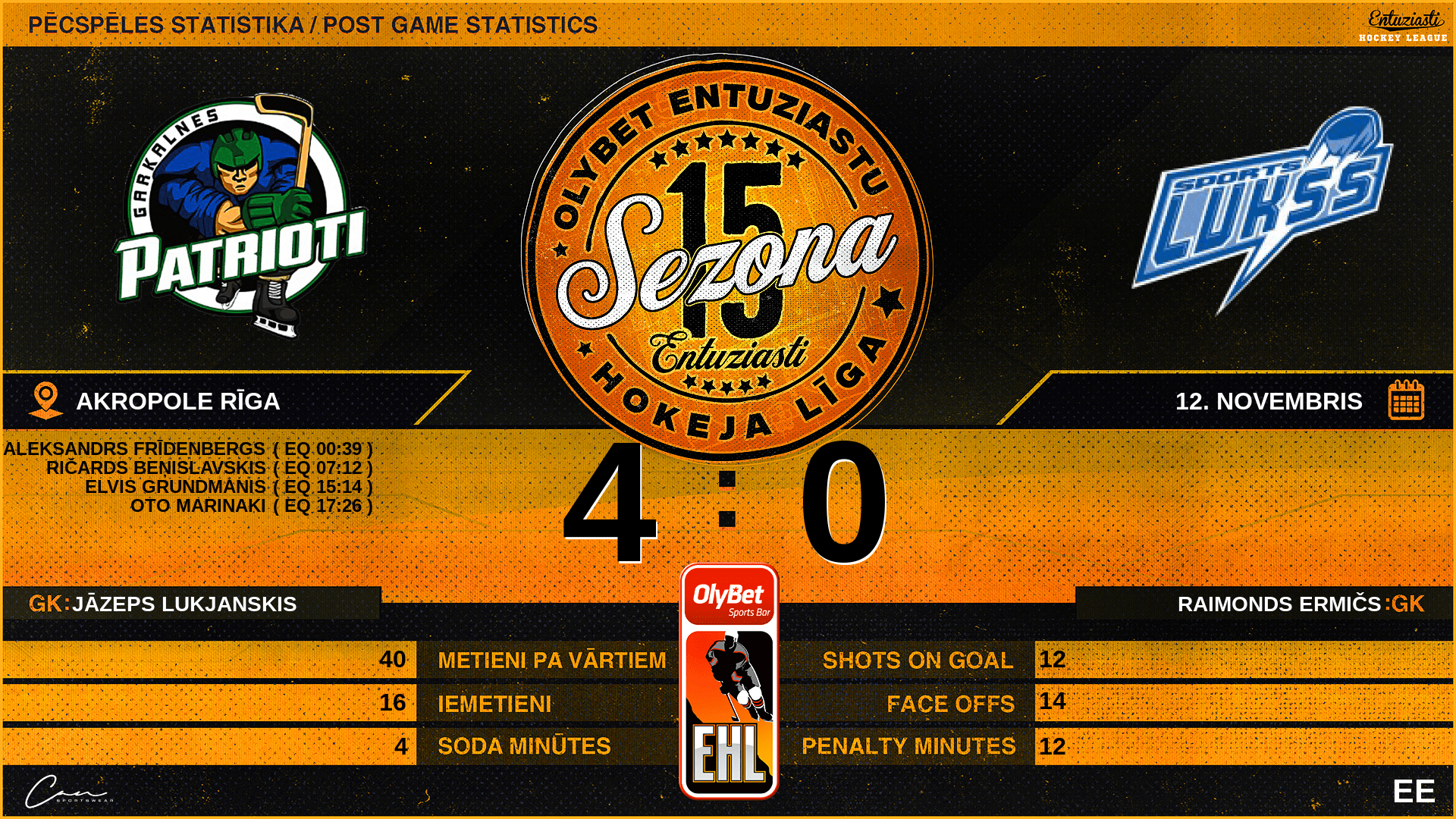 | 36:00 | GRK | GK Out | #35 Jāzeps Lukjanskis |