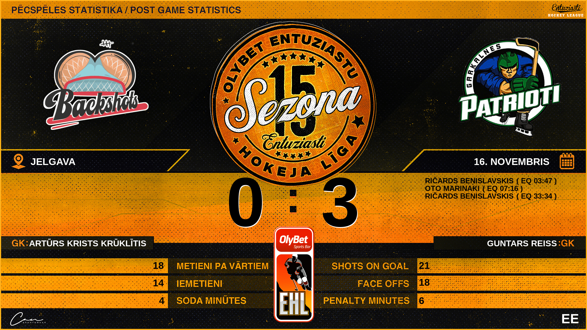 | 03:47 | GRK | Vārti (EQ) | #61 Ričards Beņislavskis, piespēles: #20 Aleksandrs Frīdenbergs, #19 Emils Masteiko |