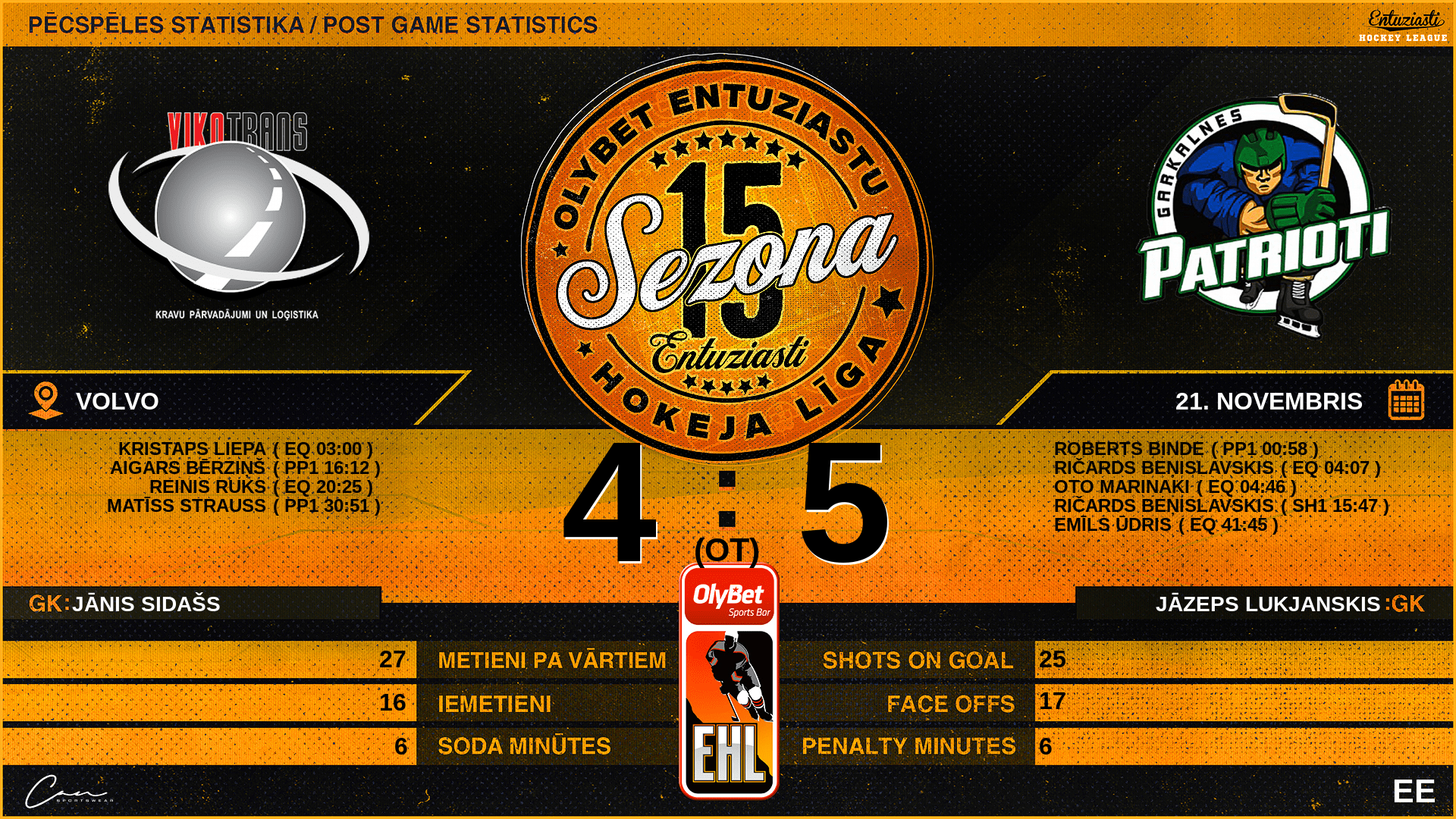 | 03:00 | VKE | Vārti (EQ) | #74 Kristaps Liepa, piespēles: #69 Lenards Roze, #81 Hārdijs Parādnieks |