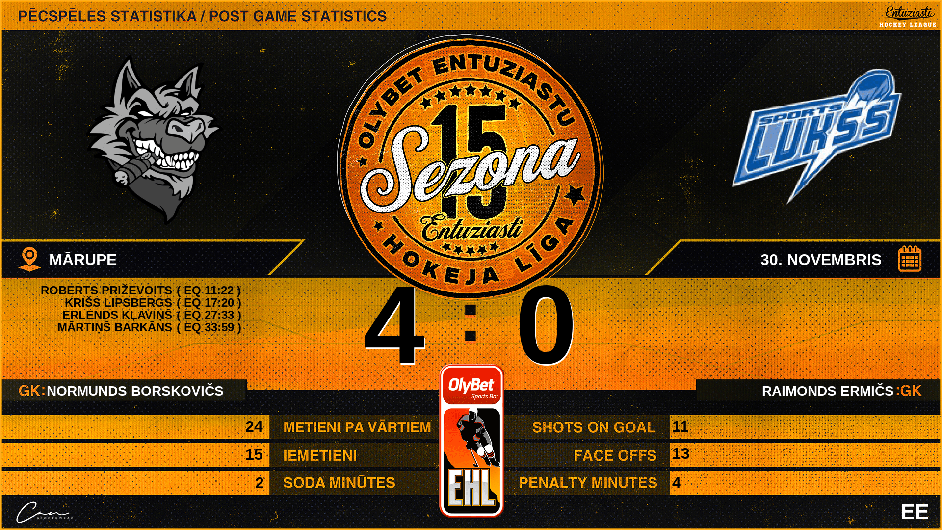 | 33:59 | WOL | Vārti (EQ) | #23 Mārtiņš Barkāns, piespēles: #20 Ričards Groskops |