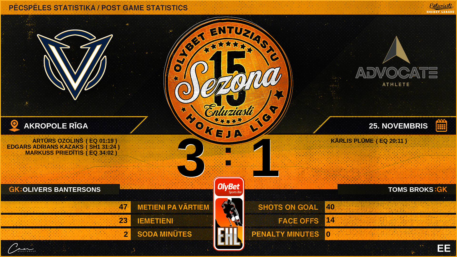 | 20:11 | ADV | Vārti (EQ) | #7 Kārlis Plūme, piespēles: #69 Rūdolfs Prūsis, #16 Emīls Potāpovs |