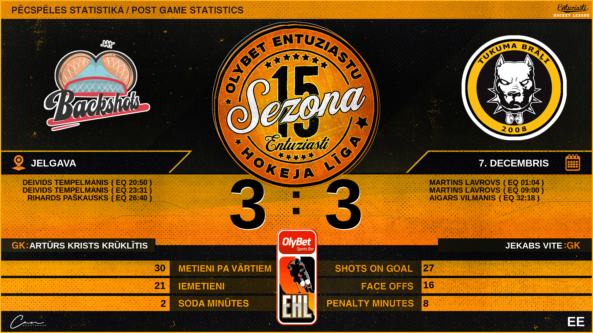 | 01:04 | TMB | Vārti (EQ) | #38 Martins Lavrovs, piespēles: #9 Kristaps Kristiņš, #24 Roberts Siliņš |