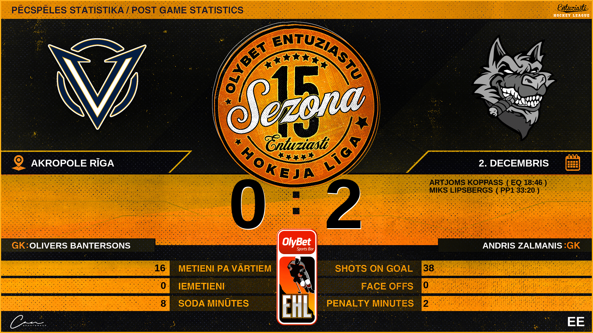 | 33:20 | WOL | Vārti (PP1) | #8 Miks Lipsbergs, piespēles: #93 Lauris Rancevs, #88 Erlends Kļaviņš |