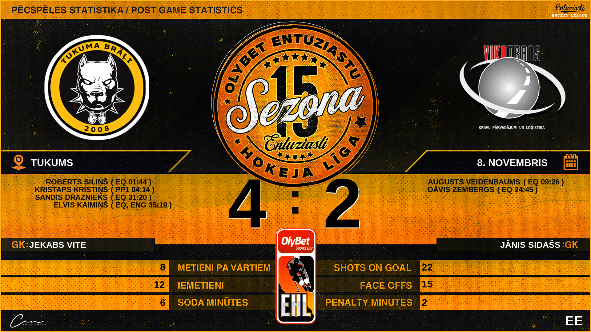 | 31:20 | TMB | Vārti (EQ) | #88 Sandis Drāznieks, piespēles: #4 Ernests Uldis Kariņš, #33 Elvis Kaimiņš |