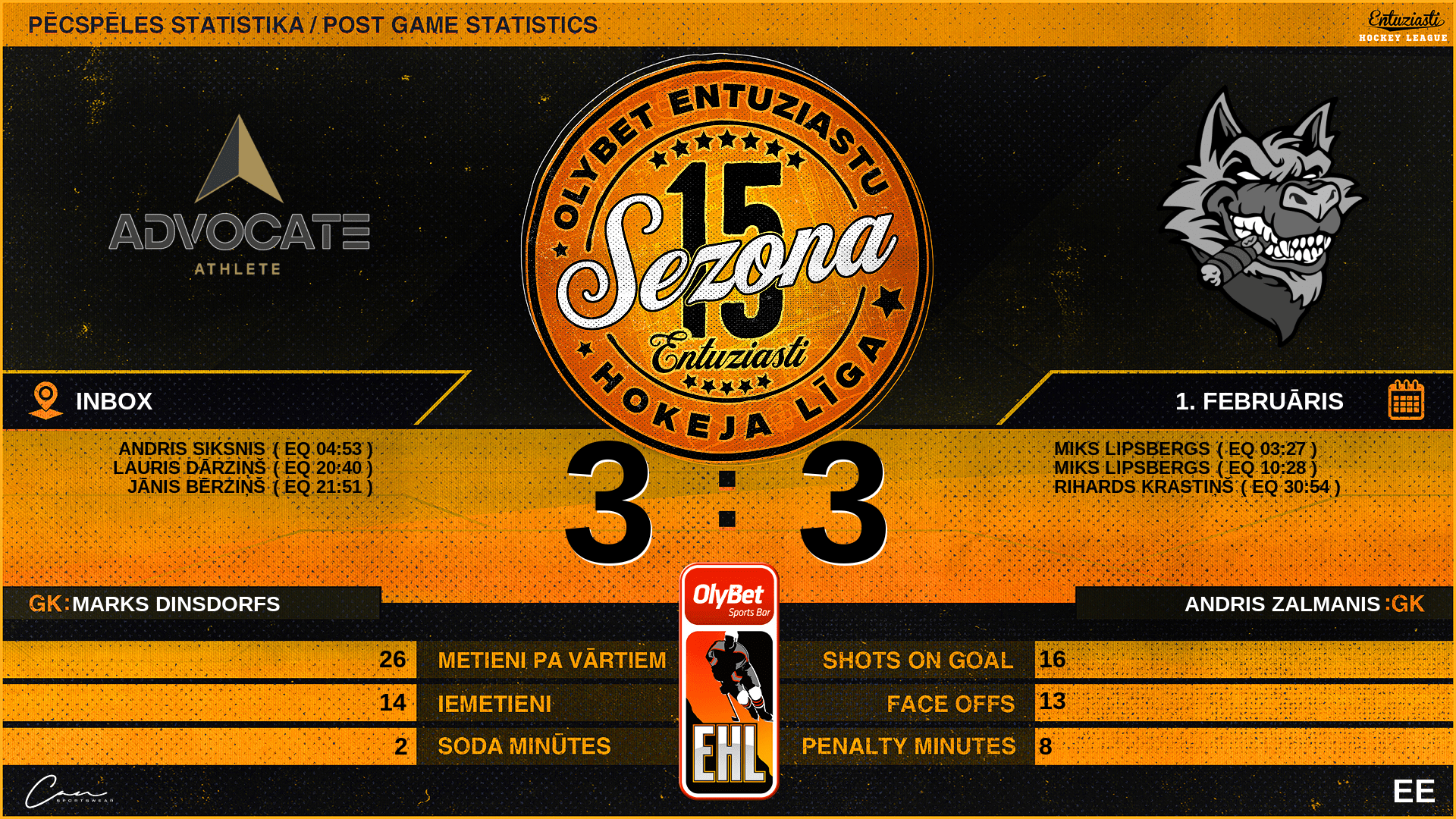 | 30:54 | WOL | Vārti (EQ) | #19 Rihards Krastiņš, piespēles: #8 Miks Lipsbergs, #88 Erlends Kļaviņš |