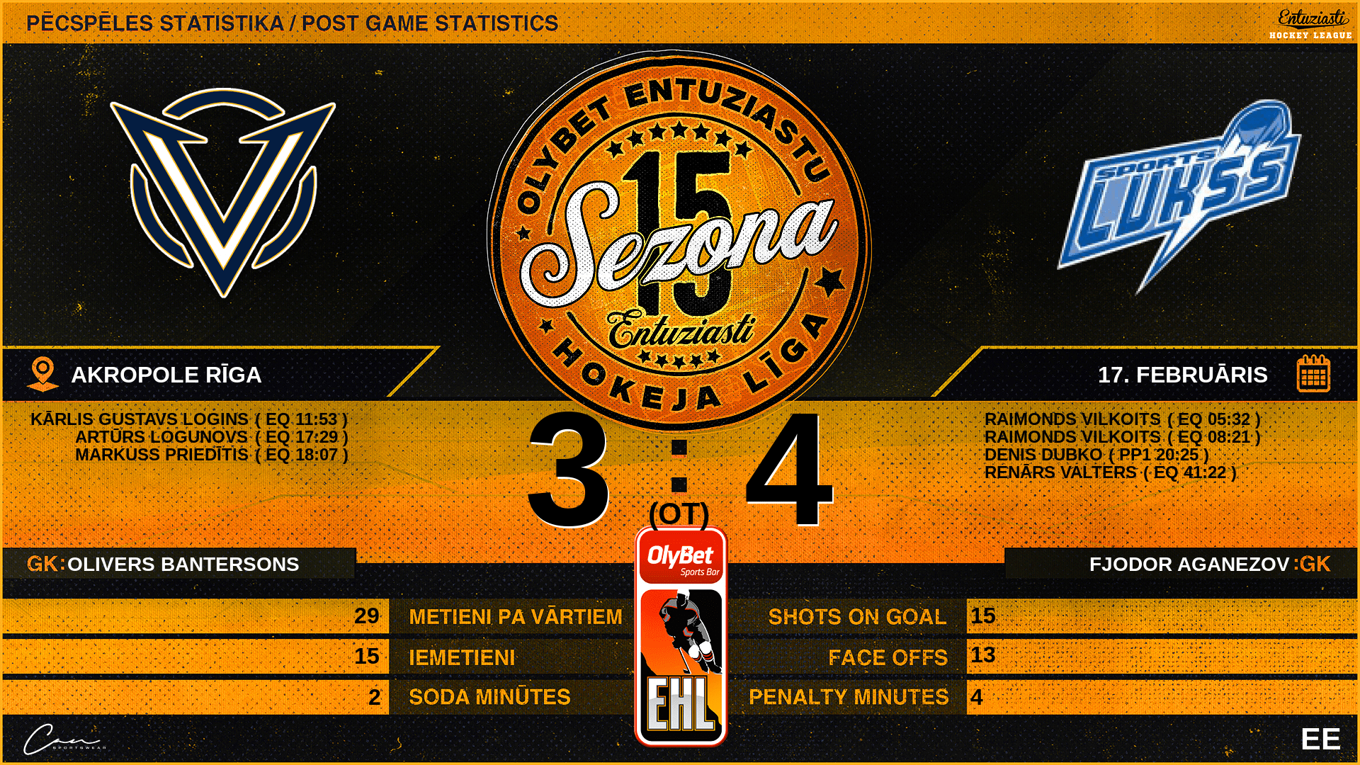 | 17:29 | VCT | Vārti (EQ) VCT 2 : 2 SPR | #11 Artūrs Logunovs, piespēles: #12 Artūrs Ozoliņš, #4 Aigars Mironovičs |