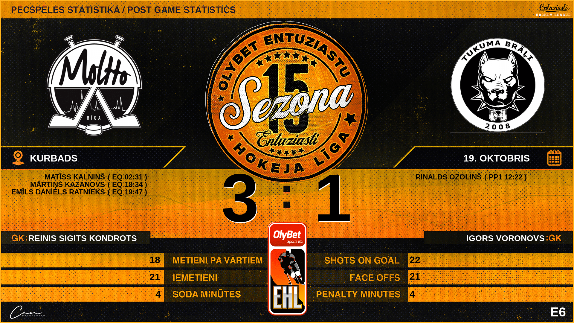 | 19:47 | MTO | Vārti (EQ) | #26 Emīls Daniels Ratnieks, piespēles: #17 Oskars Šolins, #70 Gints Andžāns |