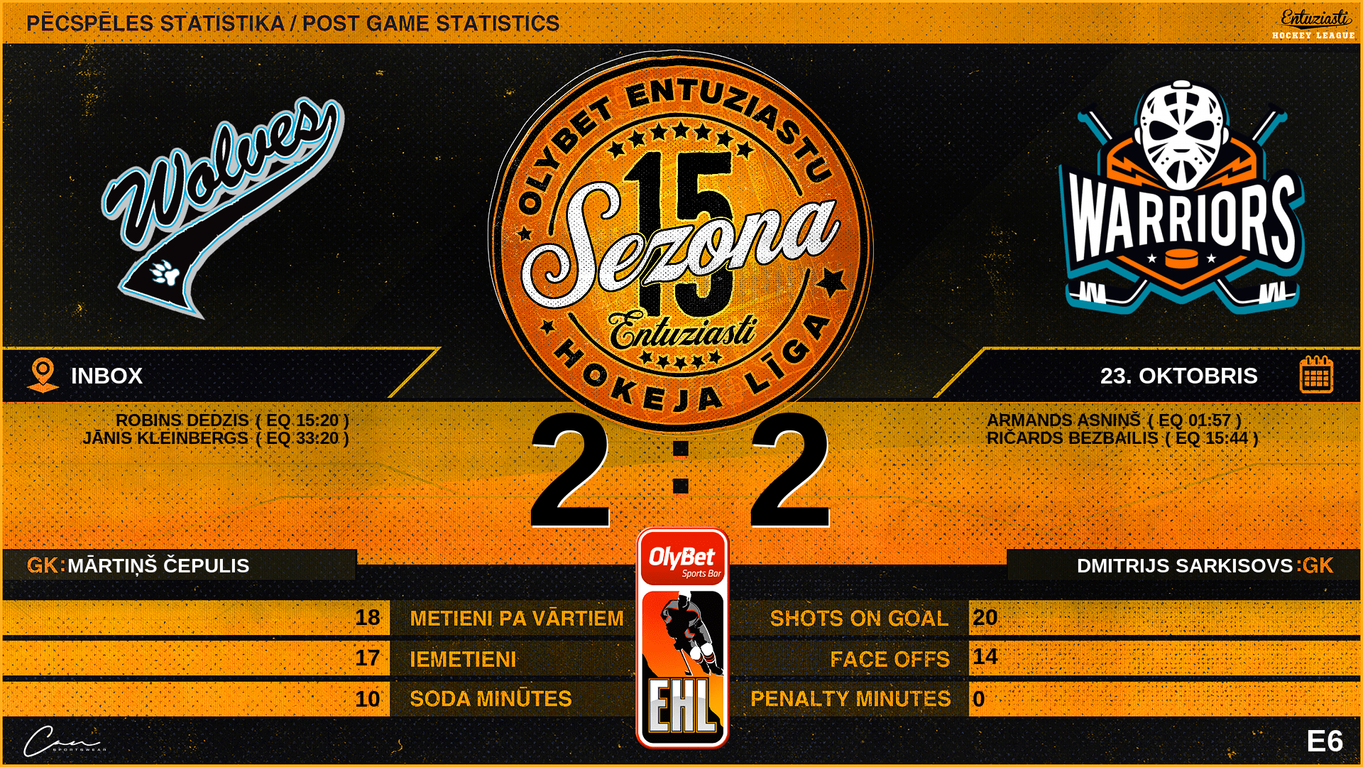 | 33:20 | WF3 | Vārti (EQ) | #7 Jānis Kleinbergs, piespēles: #16 Arturs Virvinskis, #27 Georgs Kozirevs |