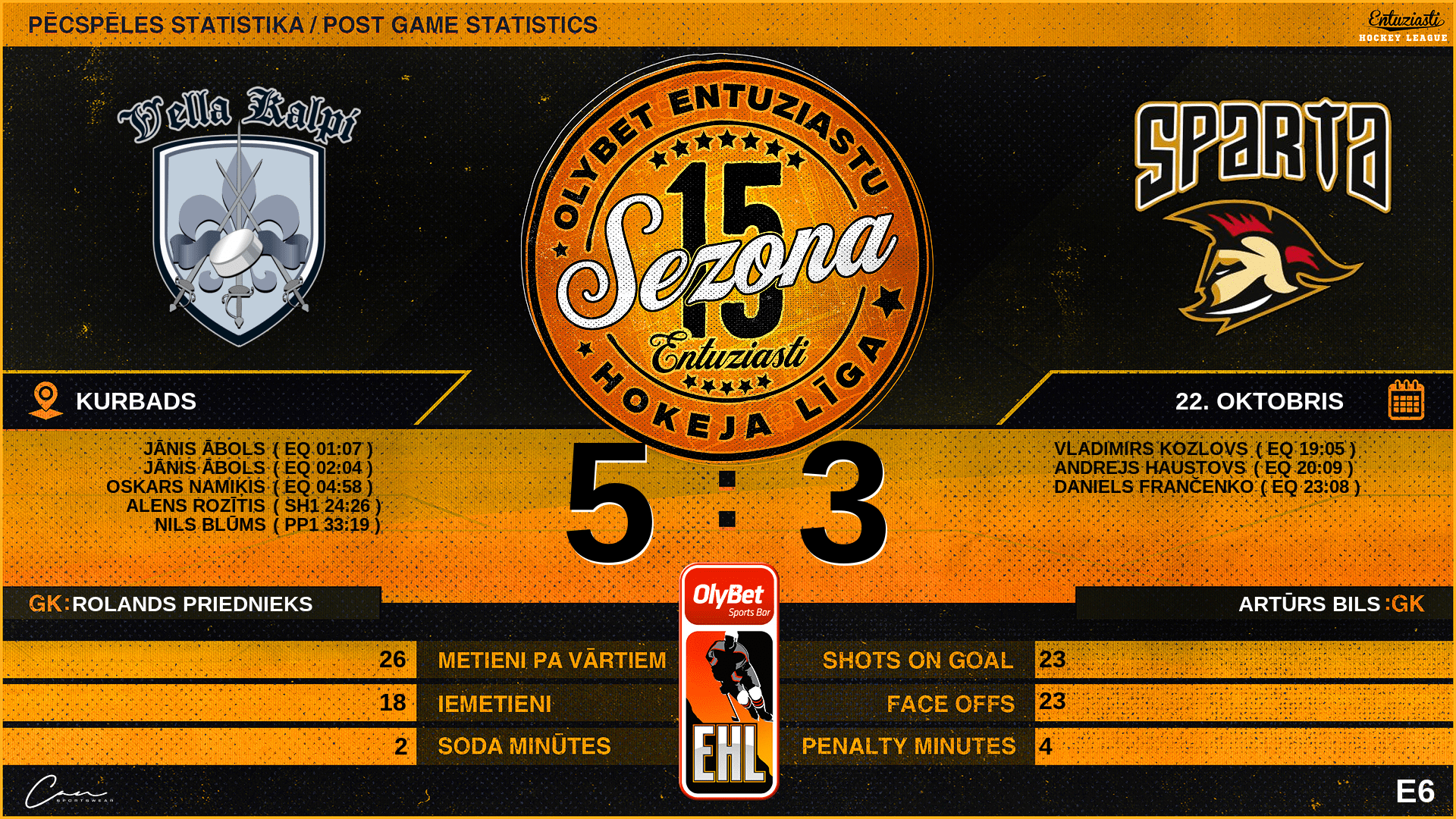 | 19:05 | SP2 | Vārti (EQ) | #26 Vladimirs Kozlovs, piespēles: #72 Daniels Frančenko, #85 Pauls Kristens Neijs |