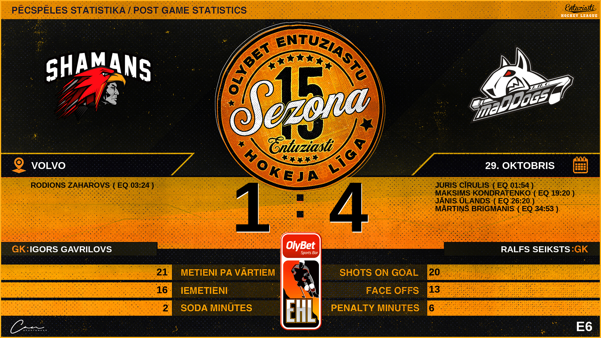 | 26:20 | MDG | Vārti (EQ) | #69 Jānis Ūlands, piespēles: #44 Staņislavs Ševčenko, #35 Vadims Sējāns |