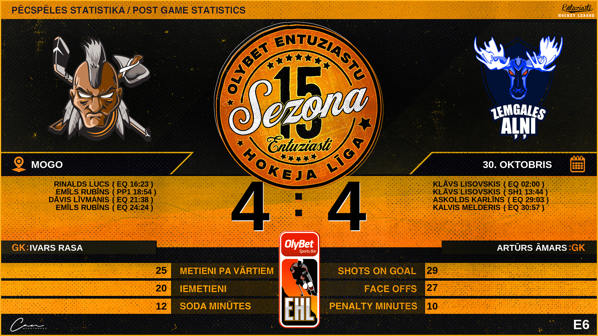 | 02:00 | ZGA | Vārti (EQ) | #93 Klāvs Lisovskis, piespēles: #21 Askolds Karlīns |