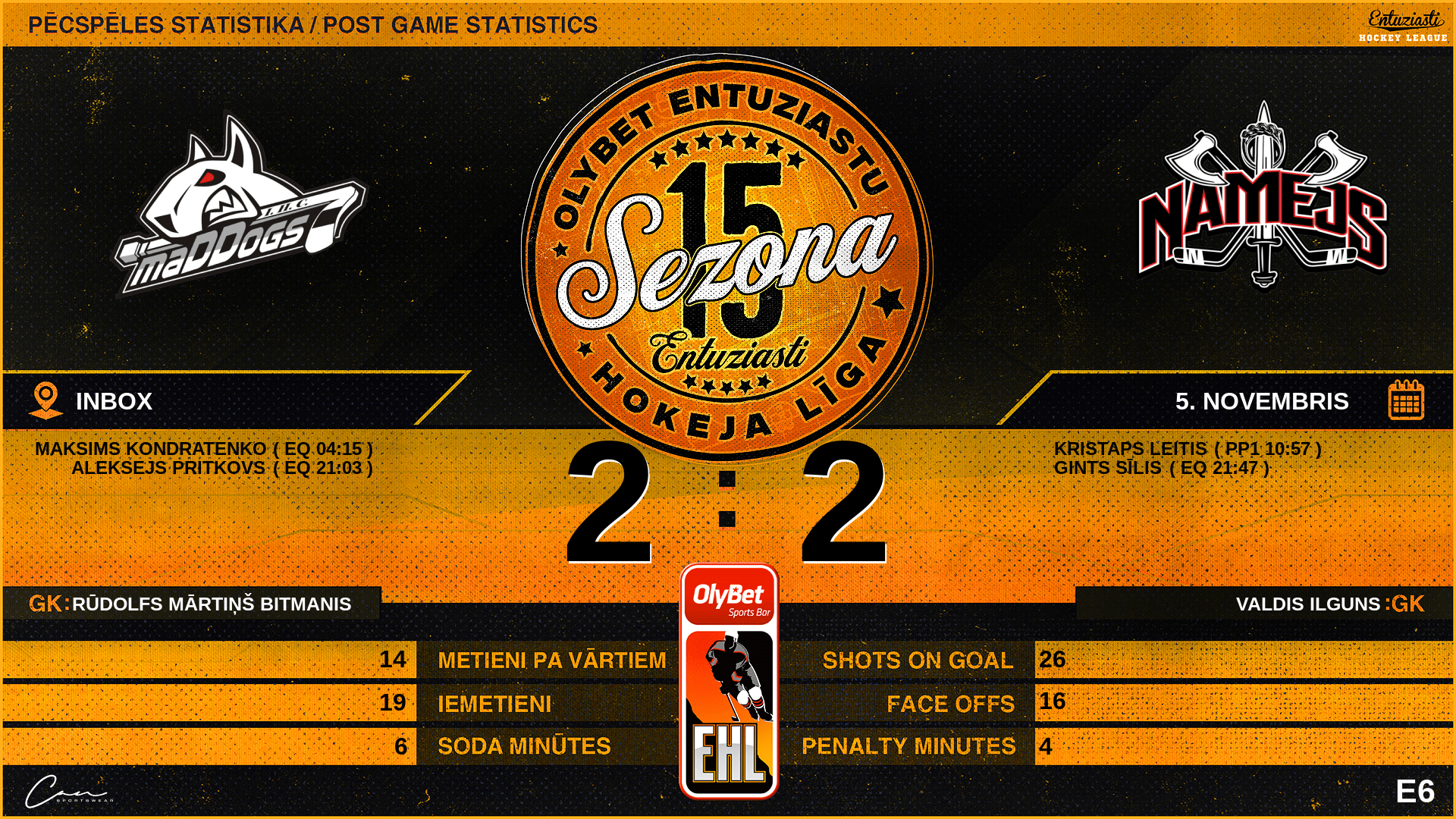 | 21:47 | NMJ | Vārti (EQ) | #41 Gints Sīlis, piespēles: #89 Ansis Brūvelis, #24 Kristaps Leitis |