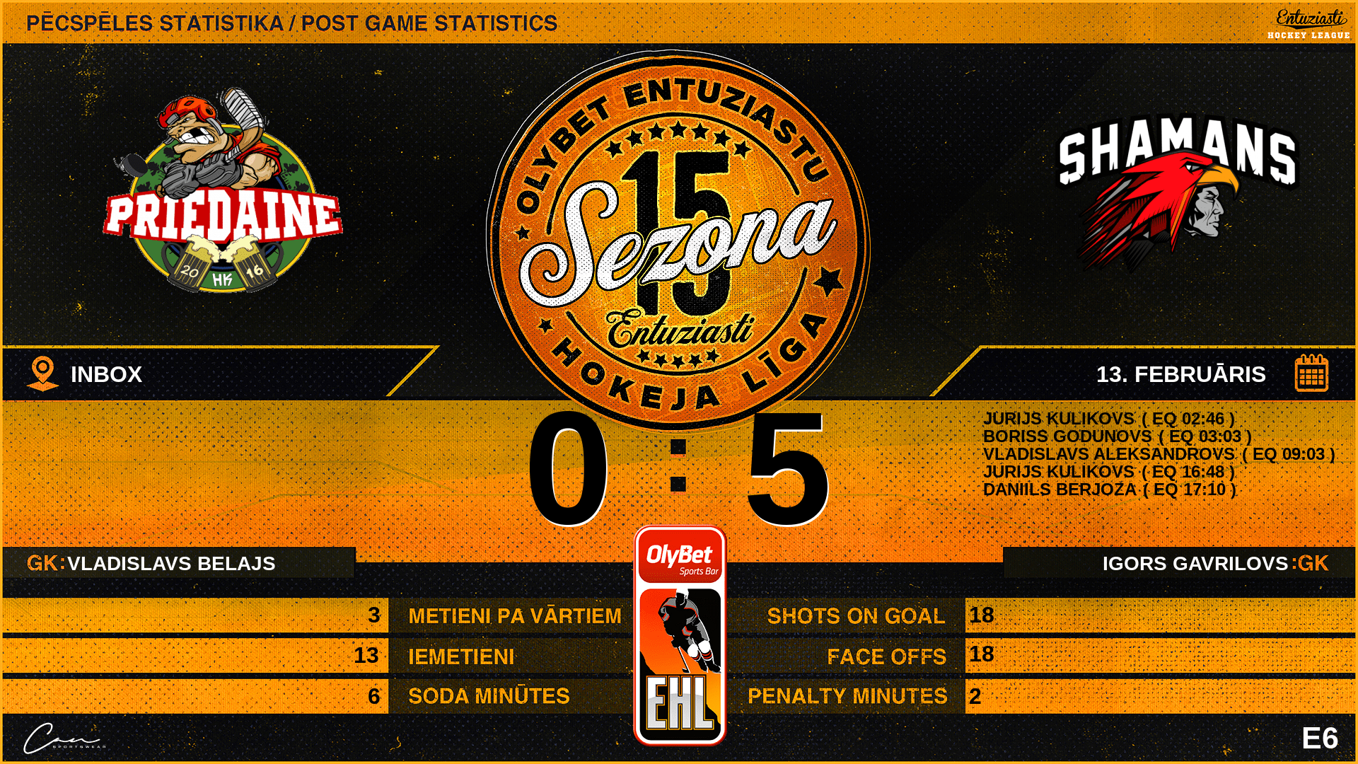 | 17:10 | SHM | Vārti (EQ) | #14 Daniils Berjoza, piespēles: #9 Aleksandrs Denisovs |