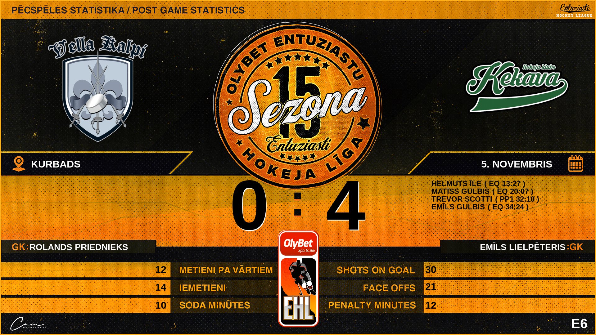 | 34:24 | ĶE2 | Vārti (EQ) | #71 Emīls Gulbis, piespēles: #2 Emīls Lielpēteris |