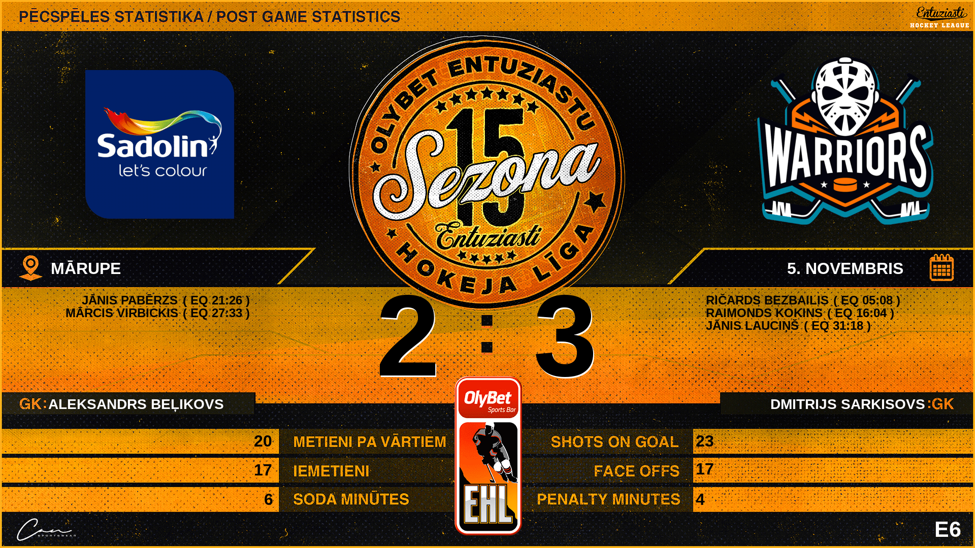 | 31:18 | WRS | Vārti (EQ) | #11 Jānis Lauciņš, piespēles: #6 Kārlis Konrads, #9 Edgars Zeidlers |