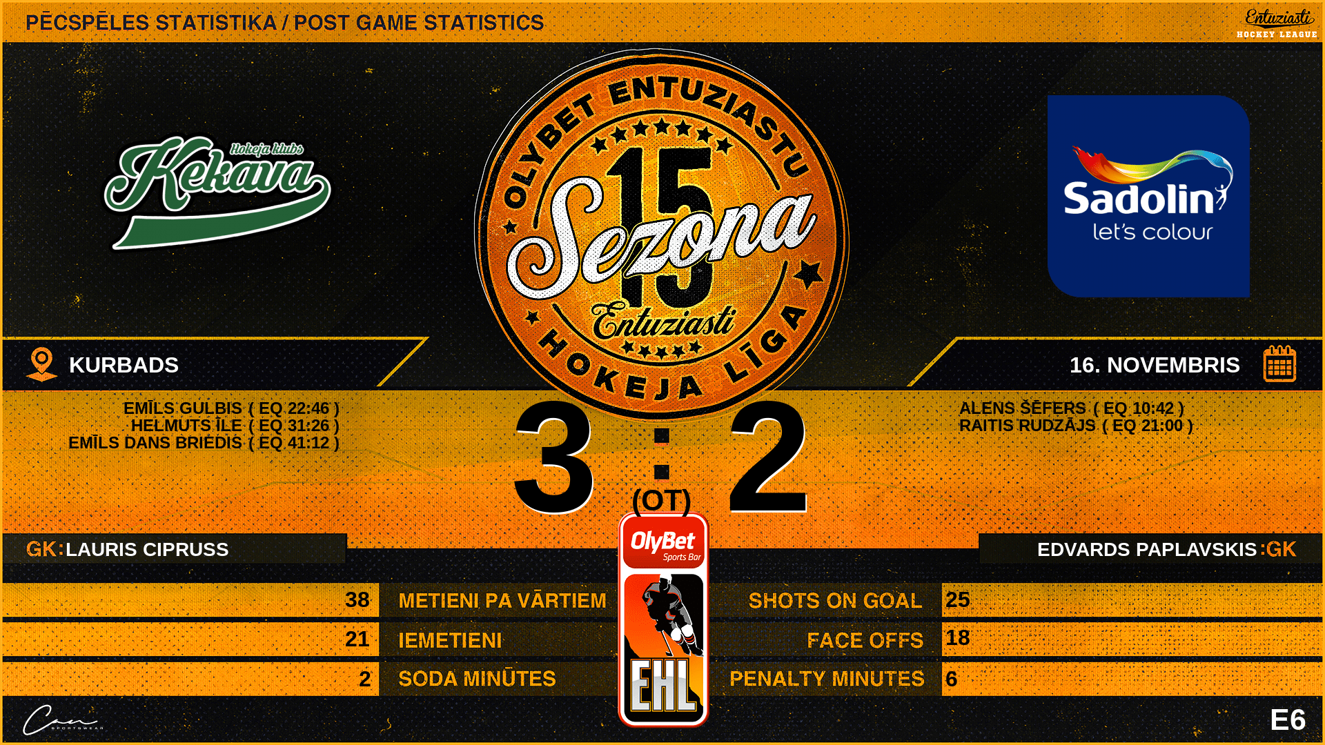 | 21:00 | SDN | Vārti (EQ) | #13 Raitis Rudzājs, piespēles: #84 Mārtiņš Vilks, #92 Jānis Pabērzs |