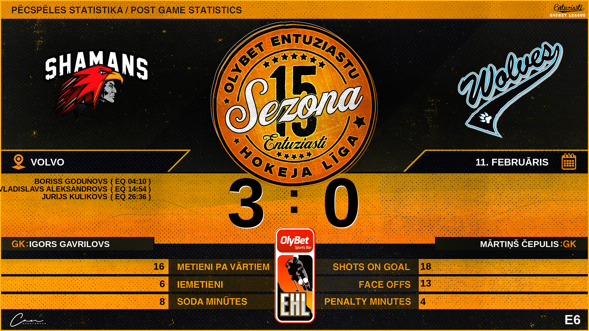 | 26:36 | SHM | Vārti (EQ) SHM 3 : 0 WF3 | #24 Jurijs Kulikovs, piespēles: #29 Aleksandrs Jeļistratovs |