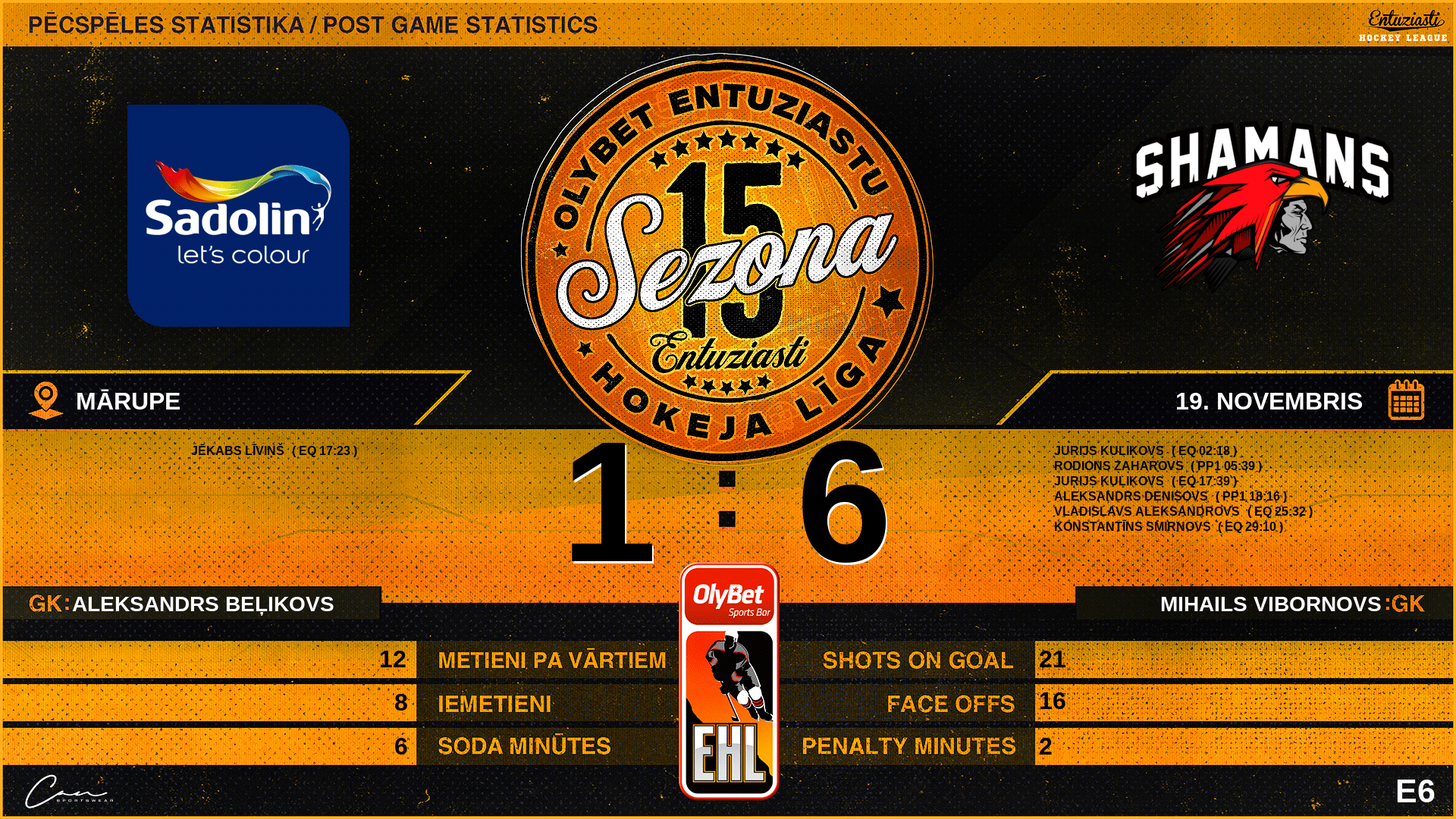 | 36:00 | SHM | GK Out | #1 Mihails Vibornovs |