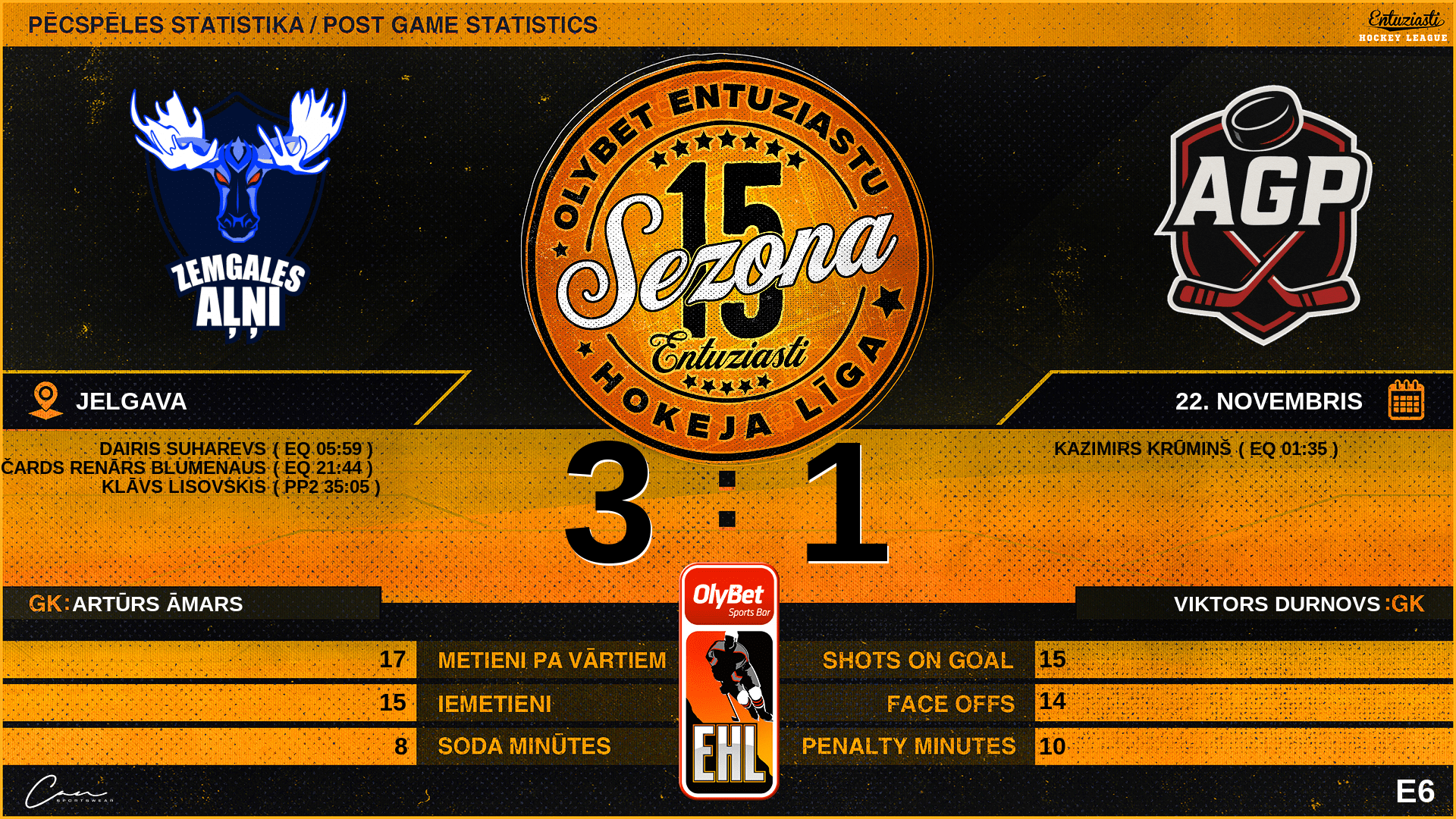| 01:35 | AGP | Vārti (EQ) | #69 Kazimirs Krūmiņš, piespēles: #25 Deniss Vjačins, #79 Vadims Koiro |