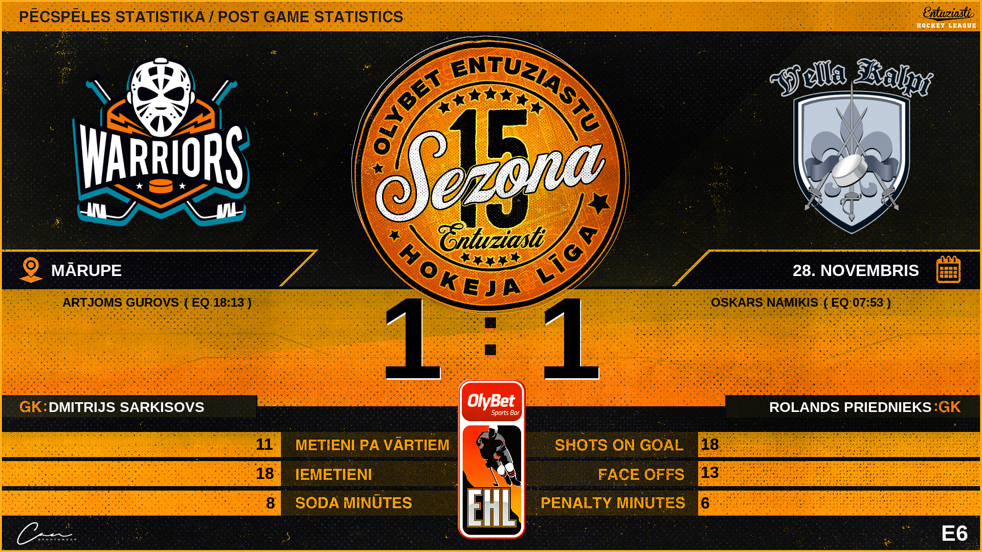 | 07:53 | VKA | Vārti (EQ) | #6 Oskars Namiķis, piespēles: #89 Raivo Midziņš, #27 Renārs Ragže |