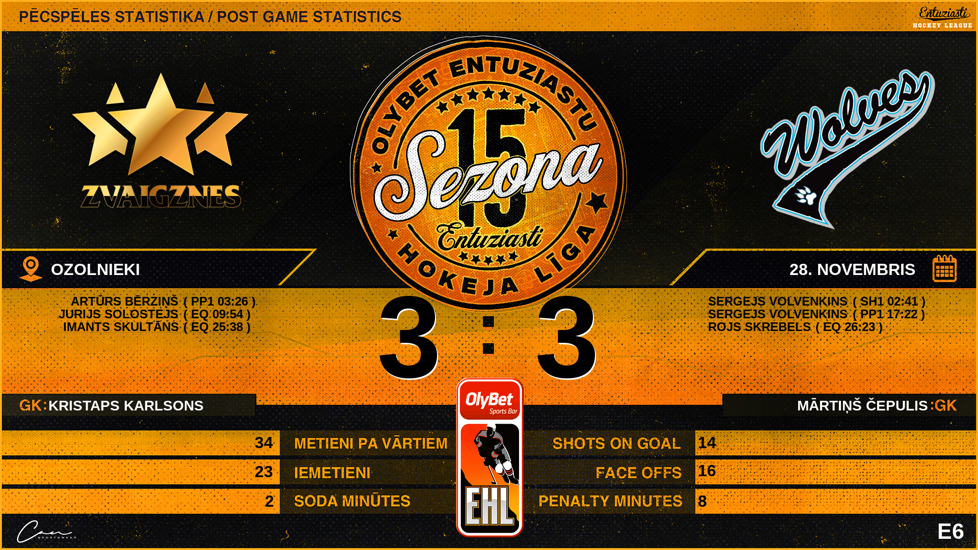 | 26:23 | WF3 | Vārti (EQ) | #97 Rojs Skrebels, piespēles: #80 Juris Sproģis |