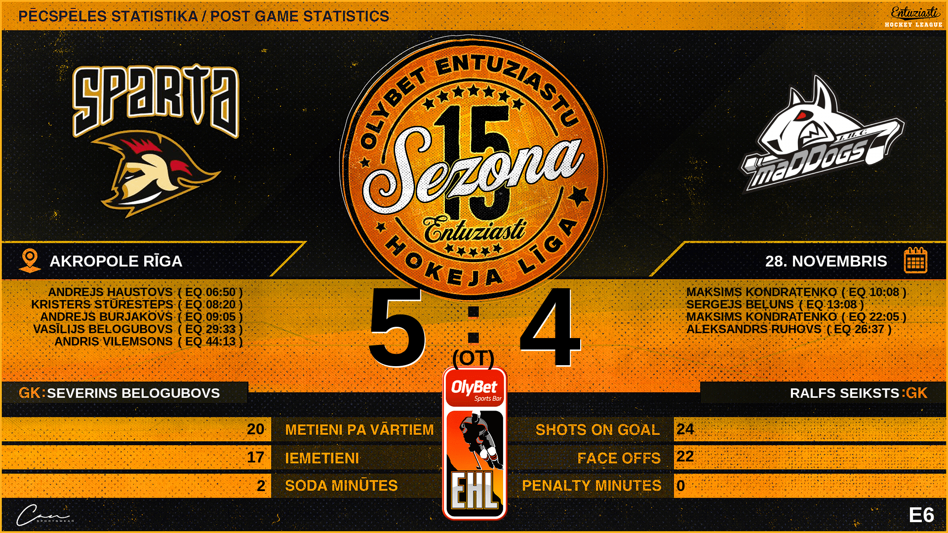 | 09:05 | SP2 | Vārti (EQ) | #28 Andrejs Burjakovs, piespēles: #21 Aleksandrs Andreičiks |