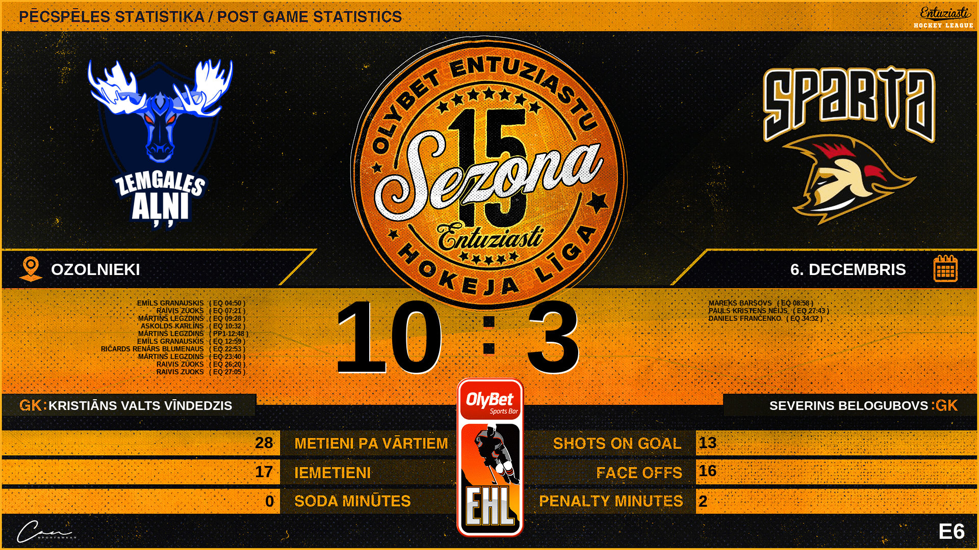 | 27:05 | ZGA | Vārti (EQ) | #97 Raivis Zuoks, piespēles: #92 Ričards Renārs Blumenaus, #29 Mārtiņš Legzdiņš |