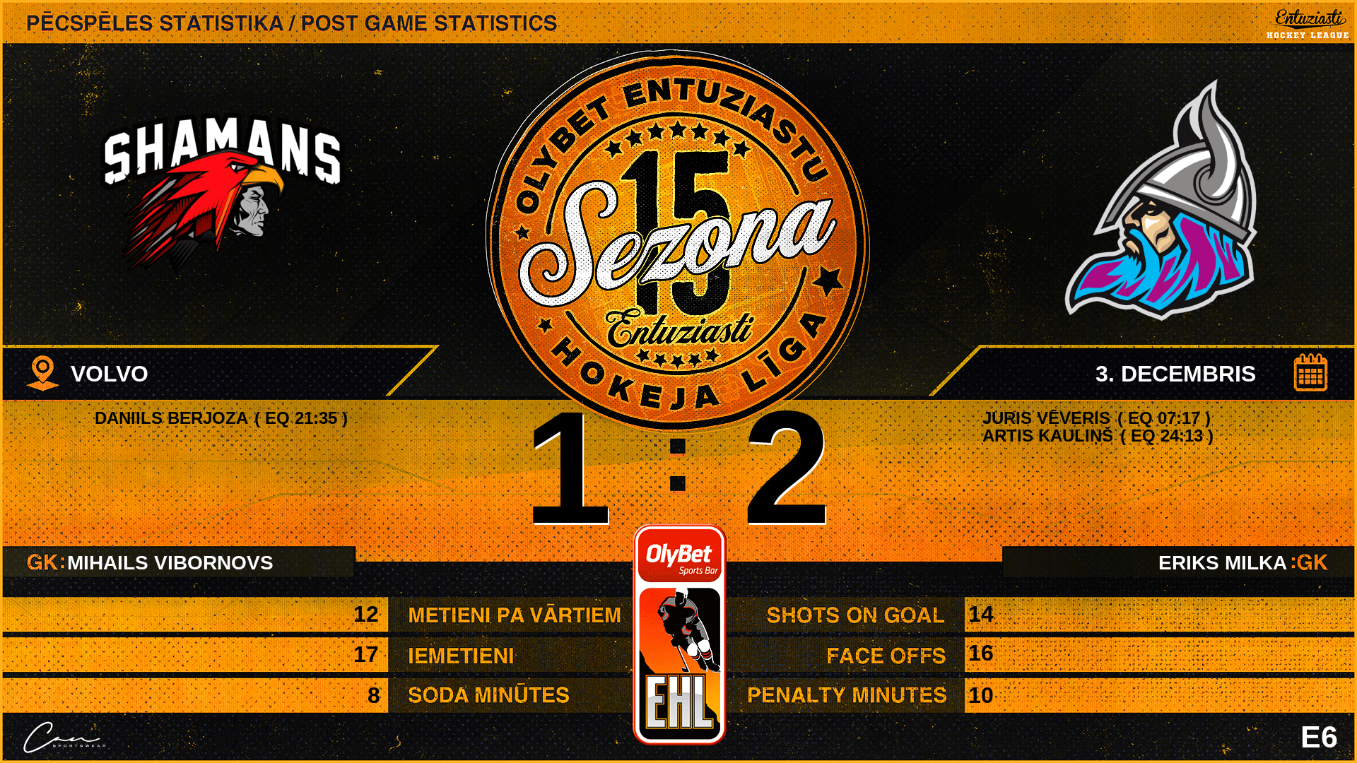 | 21:35 | SHM | Vārti (EQ) | #14 Daniils Berjoza, piespēles: #10 Kristofers Vaitonis |