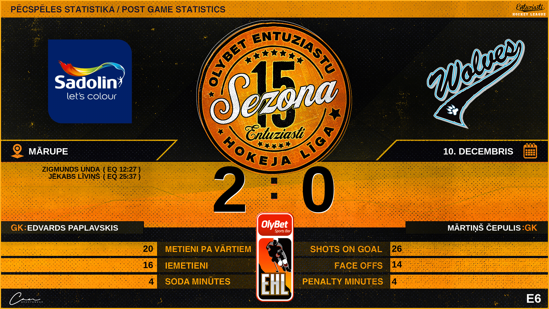 | 25:37 | SDN | Vārti (EQ) | #12 Jēkabs Līviņš, piespēles: #19 Edmunds Pūce |