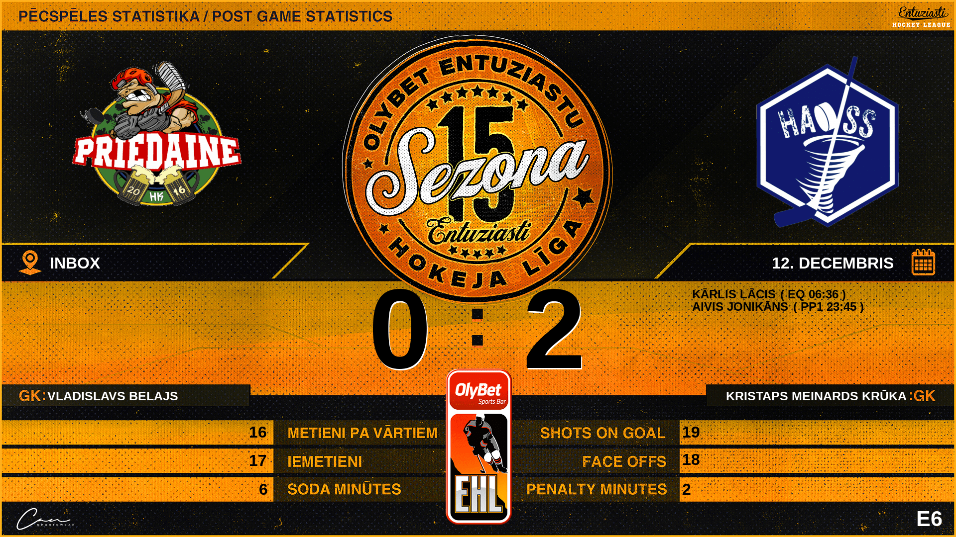 | 06:36 | HAS | Vārti (EQ) | #69 Kārlis Lācis, piespēles: #81 Austris Bernāns |