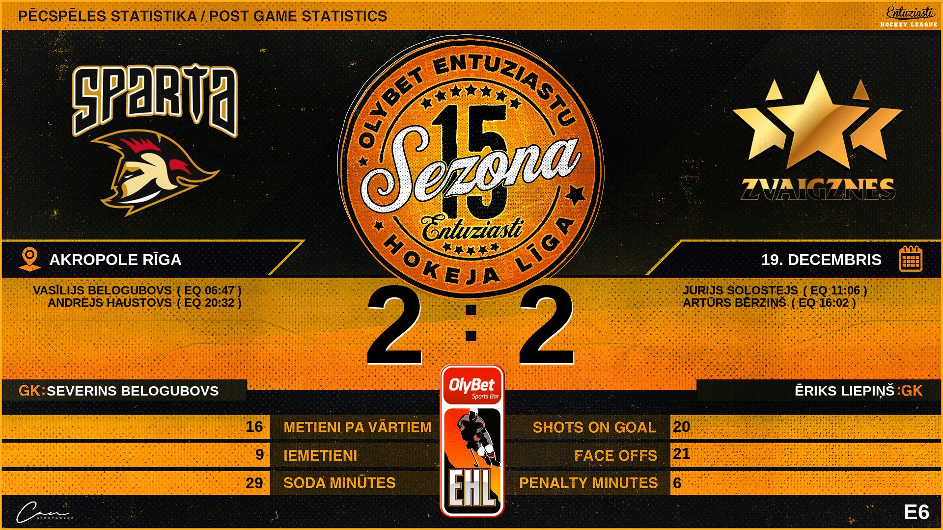 | 06:47 | SP2 | Vārti (EQ) | #20 Vasīlijs Belogubovs, piespēles: #2 Aleksandrs Pankovs |
